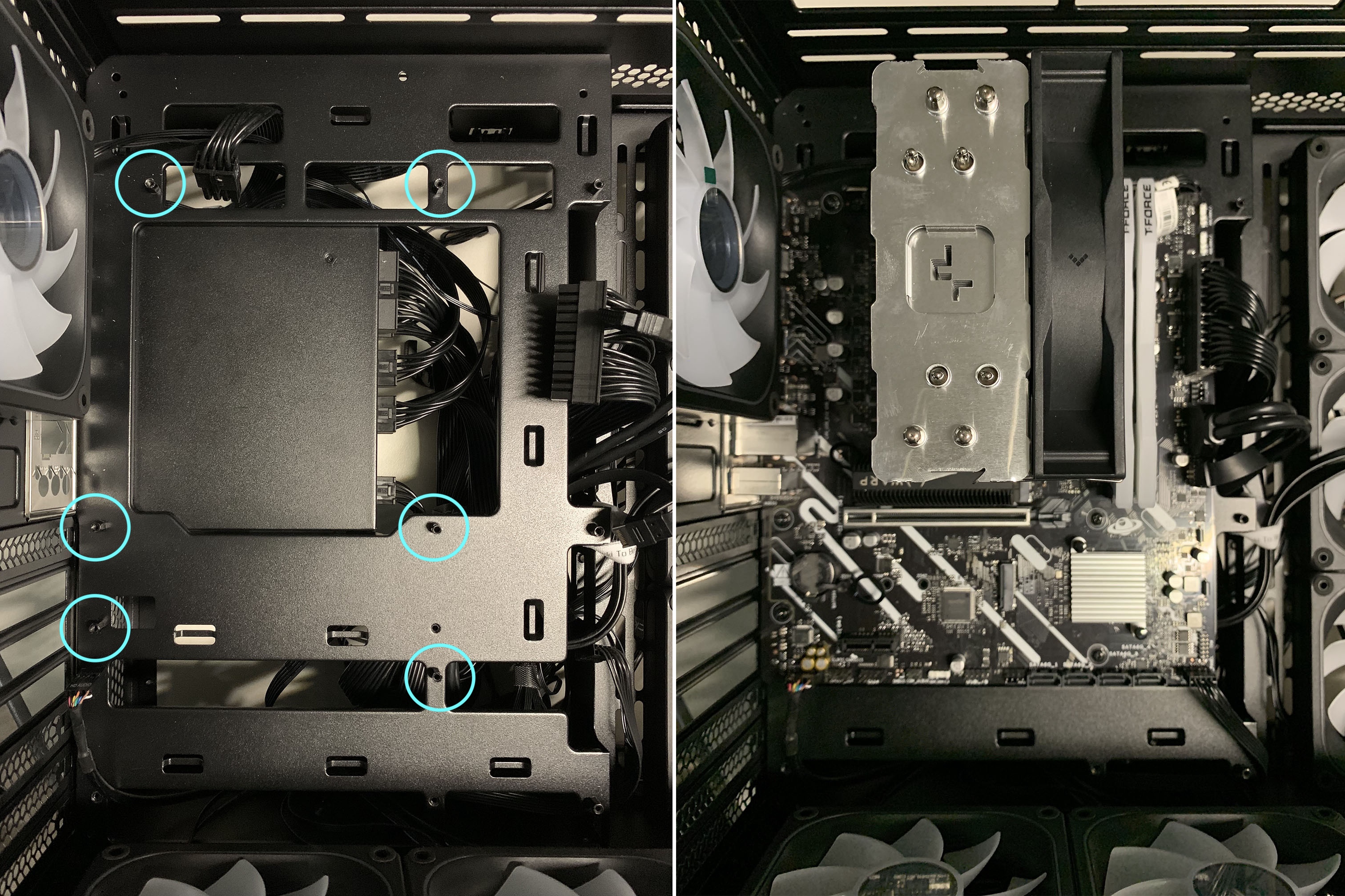 스탠드오프 위치를 메인보드에 맞게 배치 후, 나사로 메인보드를 PC케이스에 고정합니다.
