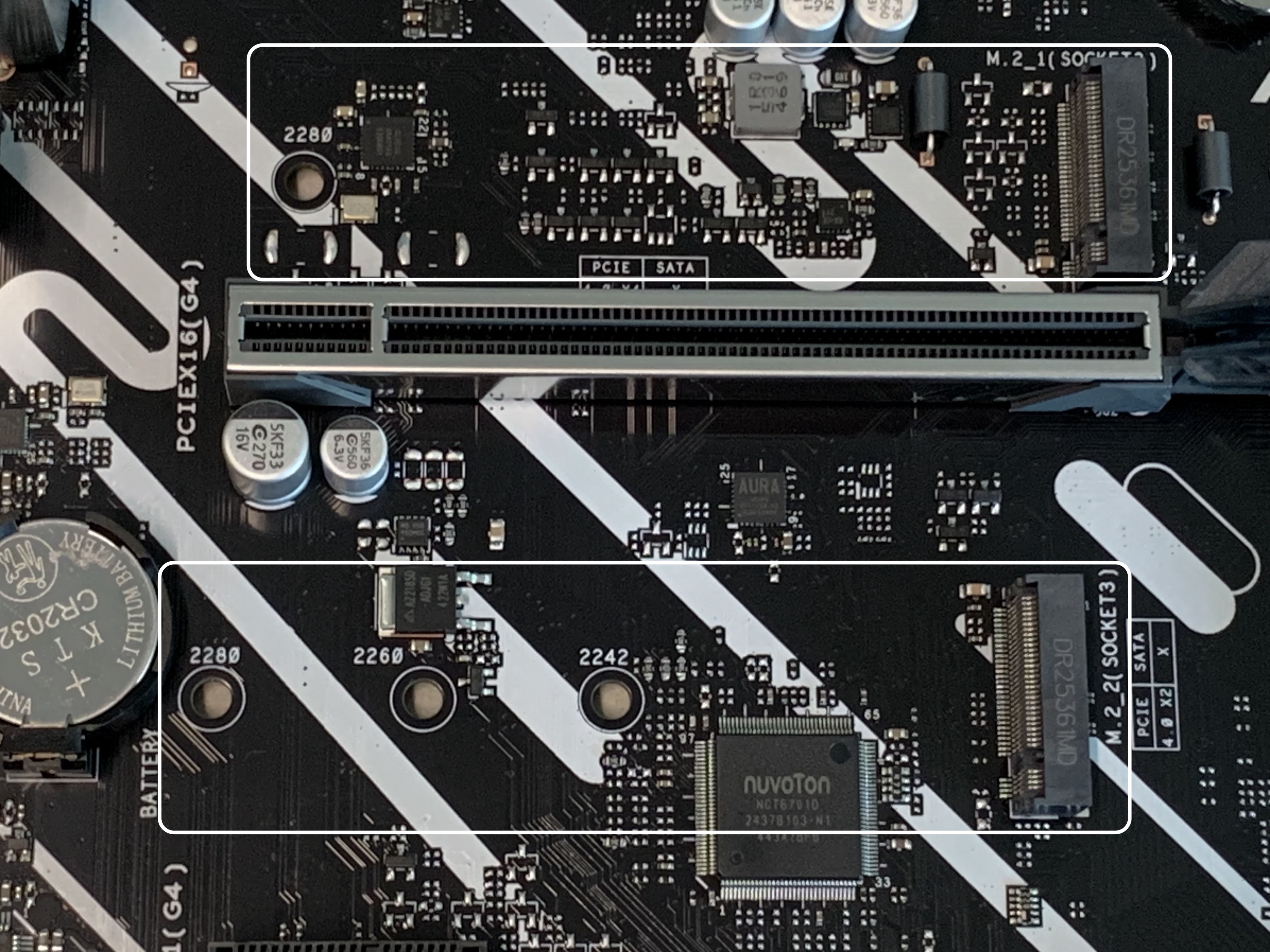 M.2 SSD 슬롯은 총 2개를 구성하고 있으며, PCIe 4.0을 지원합니다.
