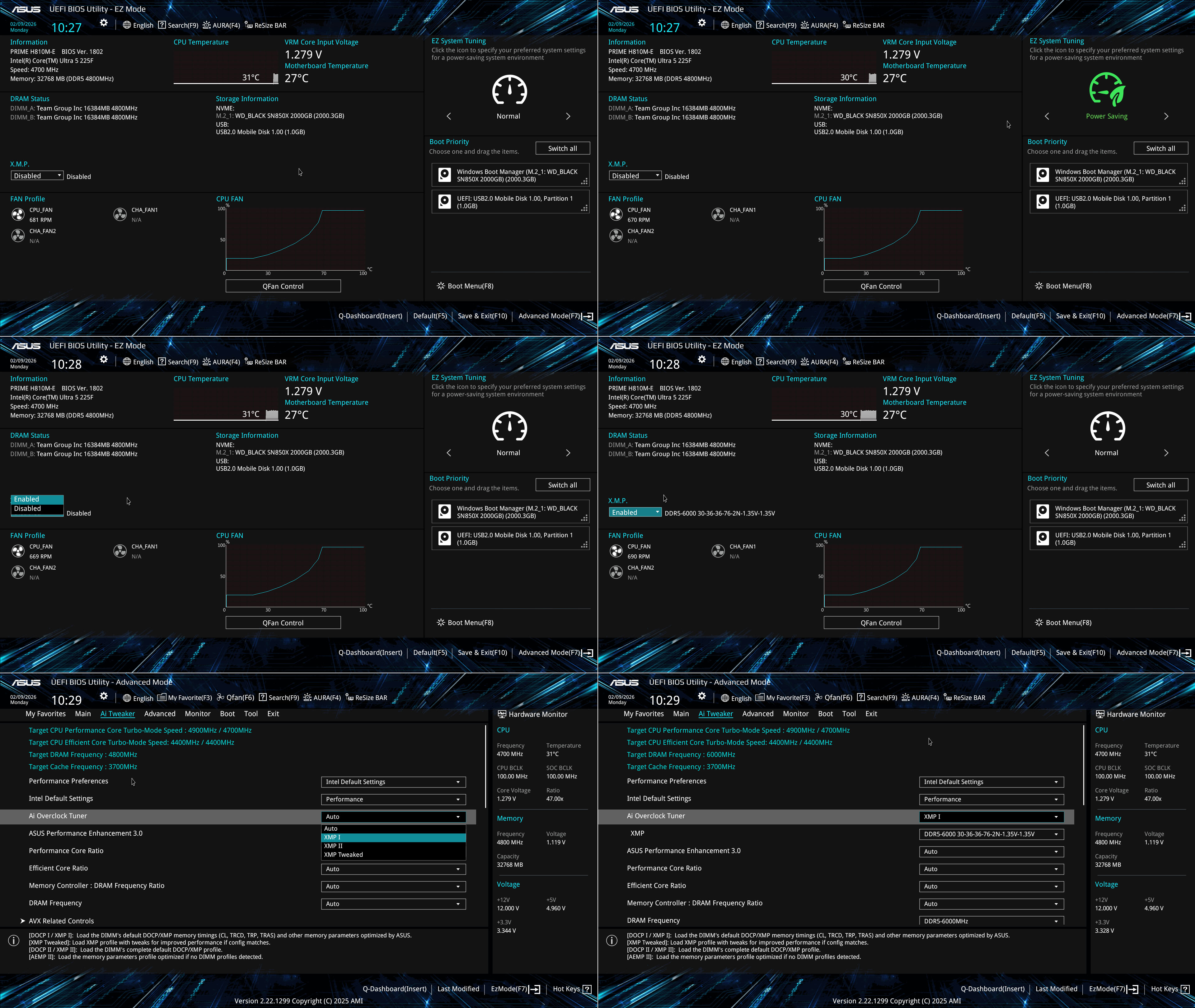 바이오스에서는 EZ System Tuning 기능을 제공하며, H810 칩셋 특성상 Normal과 Power Saving 2 두 가지 옵션을 선택할 수 있습니다. 본 테스트는 Normal 모드로 진행했습니다. 램 메모리는 XMP 프로파일을 적용해 DDR5 6000MHz CL30으로 설정했습니다.