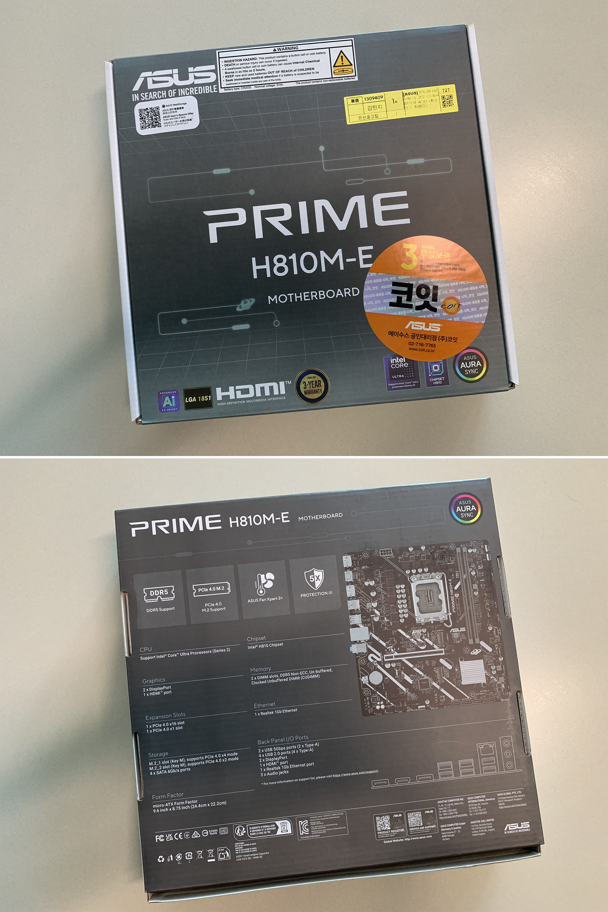 ASUS PRIME H810M-E 박스 앞면에는 코잇 3년 AS 무상보증 스티커가 붙어 있고, 뒷면에는 ASUS PRIME H810M-E의 특징을 확인할 수 있습니다.