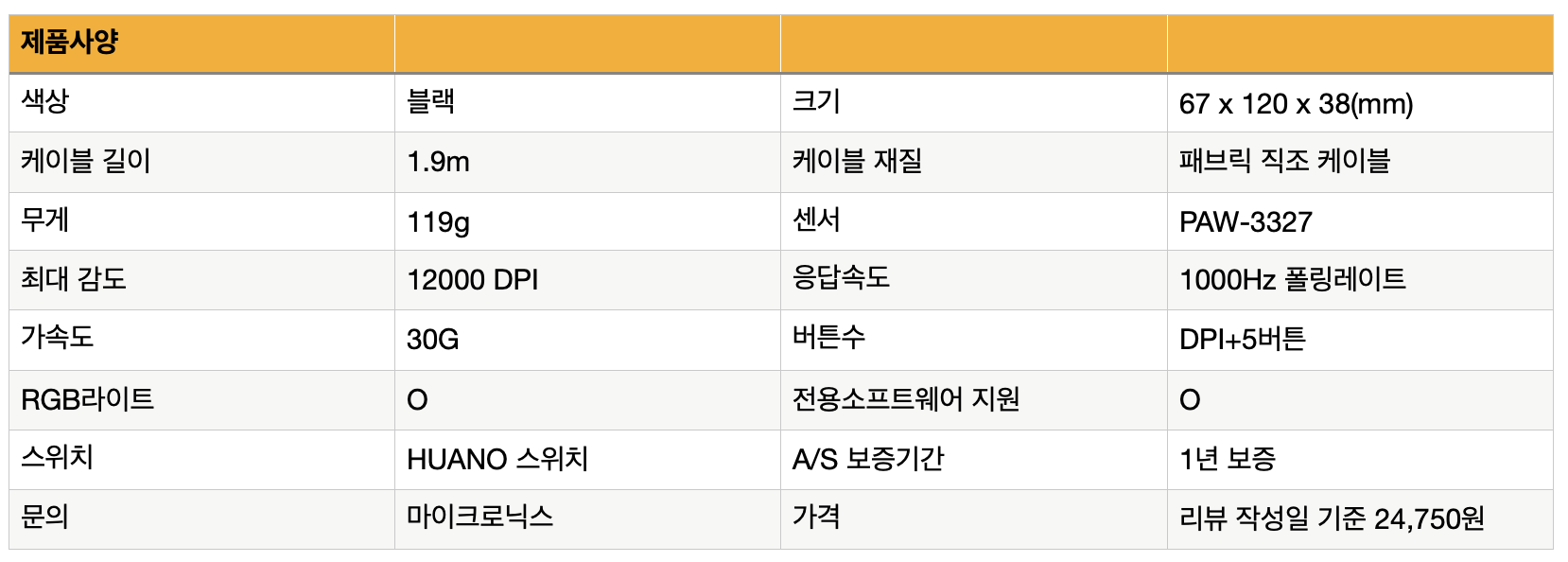 MANIC MG530 게이밍 마우스는 고급센서 PAW-3327을 채택되었고, HUANO 스위치를 사용해서 뛰어난 게임 퍼포먼스와 최적의 클릭감이 기대가 됩니다. 그리고 선 꼬임이 적은 패브릭 재질의 케이블 구성까지, 예상했던것보다 저렴한 2만 5천원의 가격이 인상적입니다.