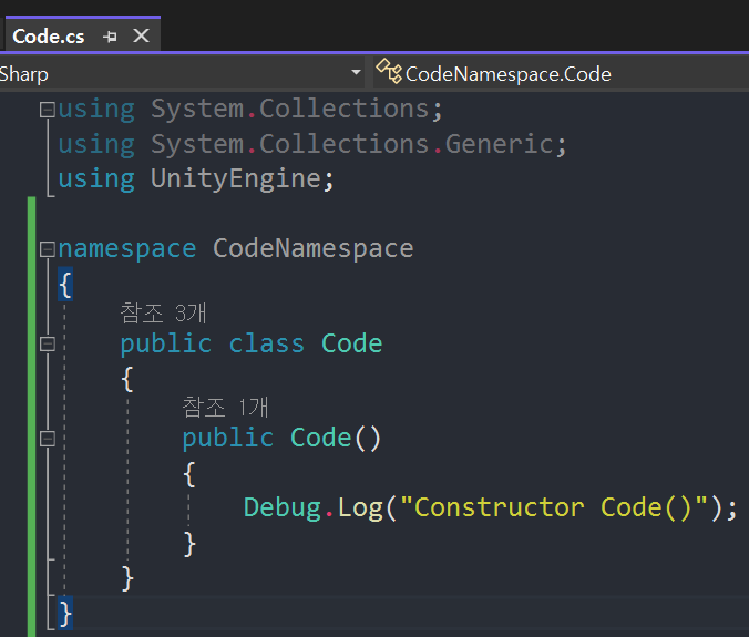 CodeNamespace라는 네임스페이스로 감싸고, 그 안에 Code라는 클래스를 만들었습니다.