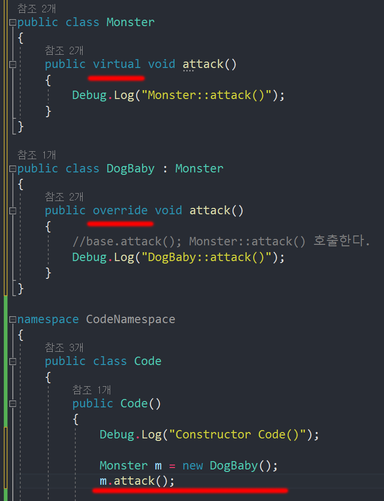 virtual은 아래를 참고하세요. 사용법이 자식 클래스에서 virtual이 아닌 override를 사용하는겁니다.