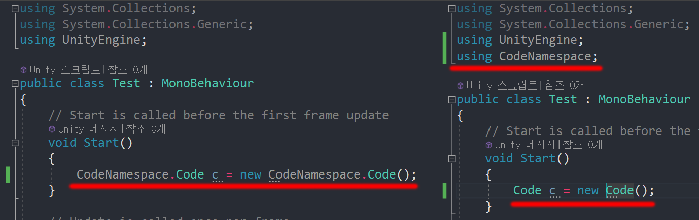 CodeNamespace.Code이렇게 객체를 계속 사용하기에는 코드 작성도 불편하고, 나중에 코드의 가독성이 떨어지게 됩니다. 네임스페이스가 모호해 보이지 않는이상 using 네임스페이스명; 으로 긴~ 이름을 가볍게 작성할 수 있도록 할수 있습니다.