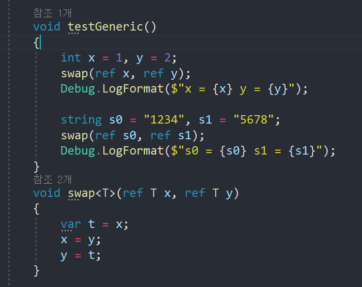 앞서 본 코드는 원하는 리턴 타입을 받고 싶을때 사용했고, 이번에는 함수 호출시 임의의 타입을 파라미터로 사용 예다.