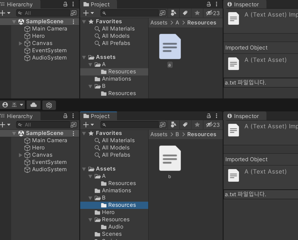 a라고 하더라도, Assets > A > Resources > a.txt 파일을 정확히 데이터를 가져온다.