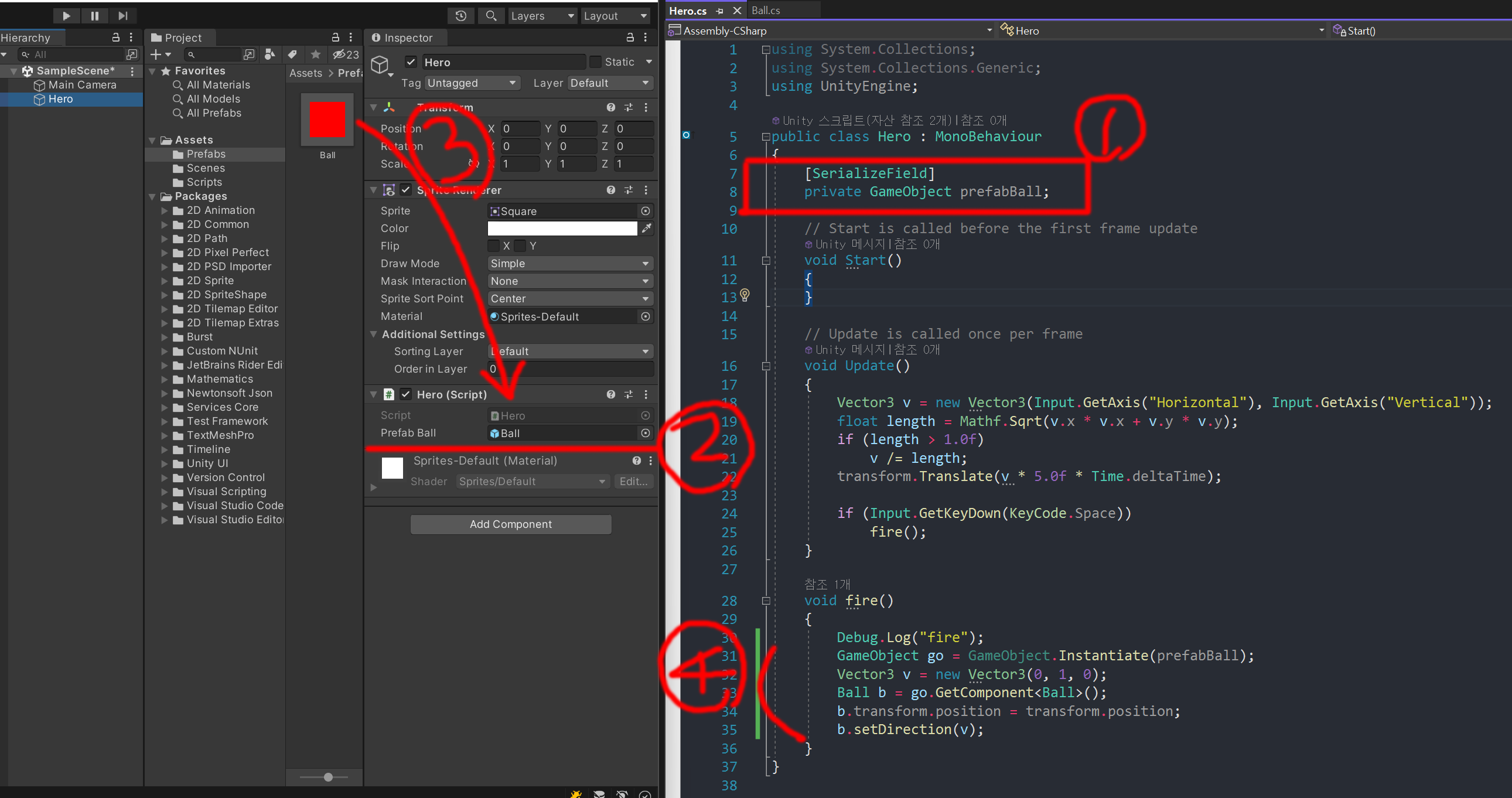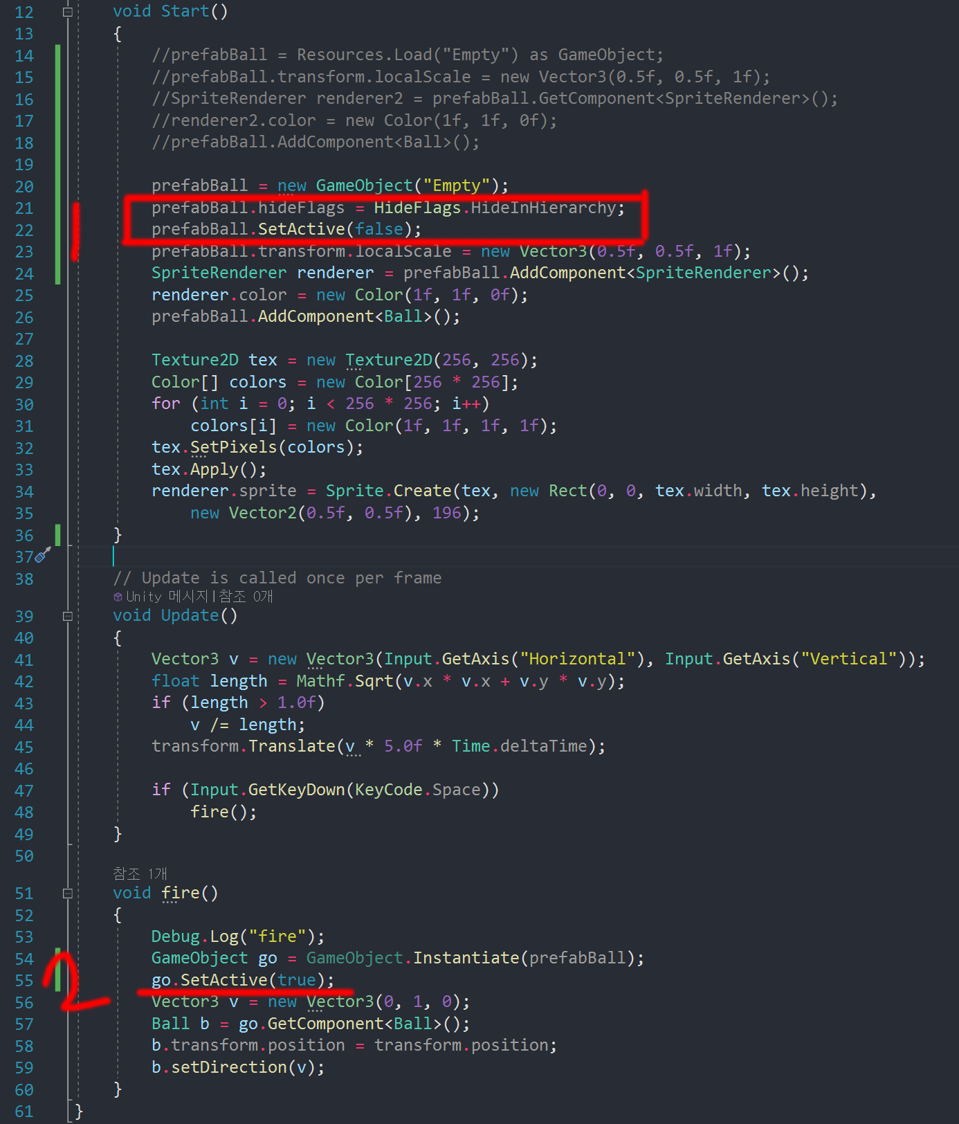 3. GameObject go = GameObject.Instantiate(prefabBall); 비활성화 오브젝트를 만든다음 바로 go.SetActive(true); 로 바로활성화한다.
