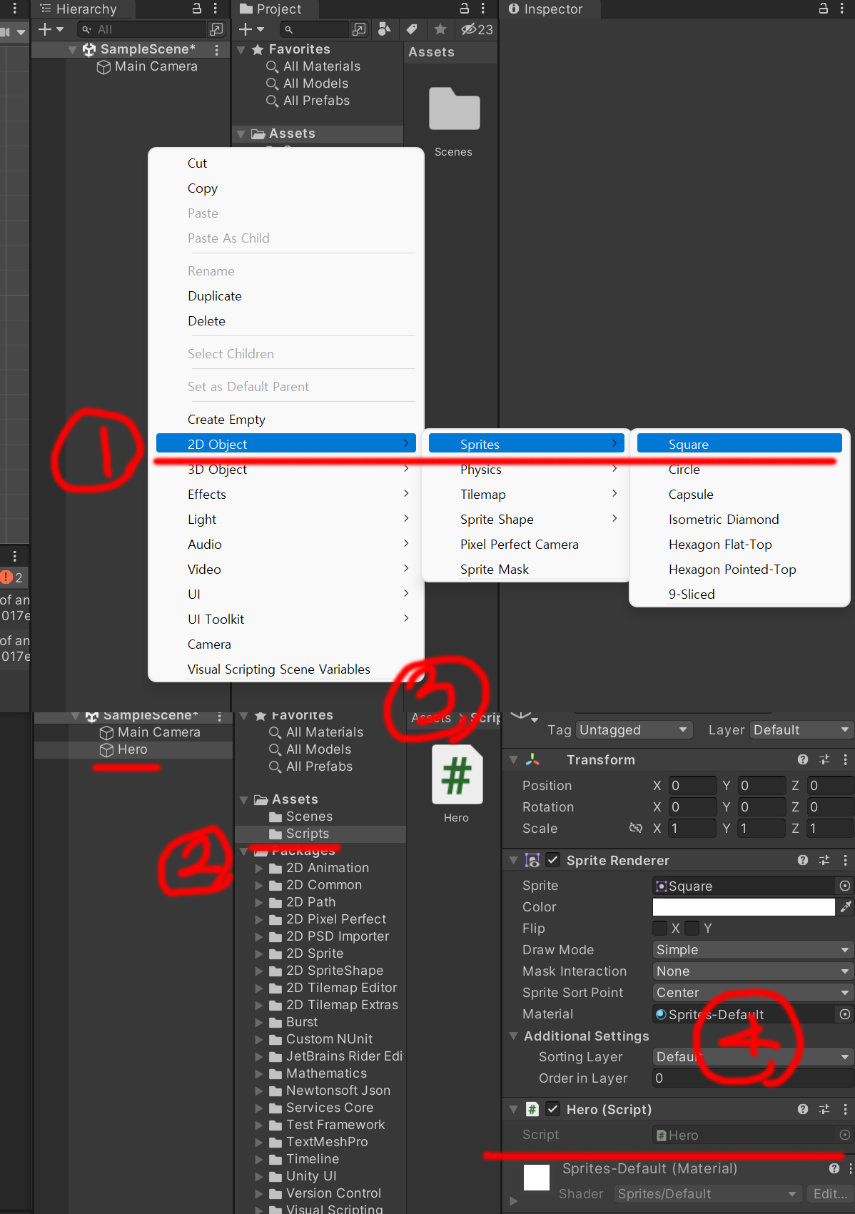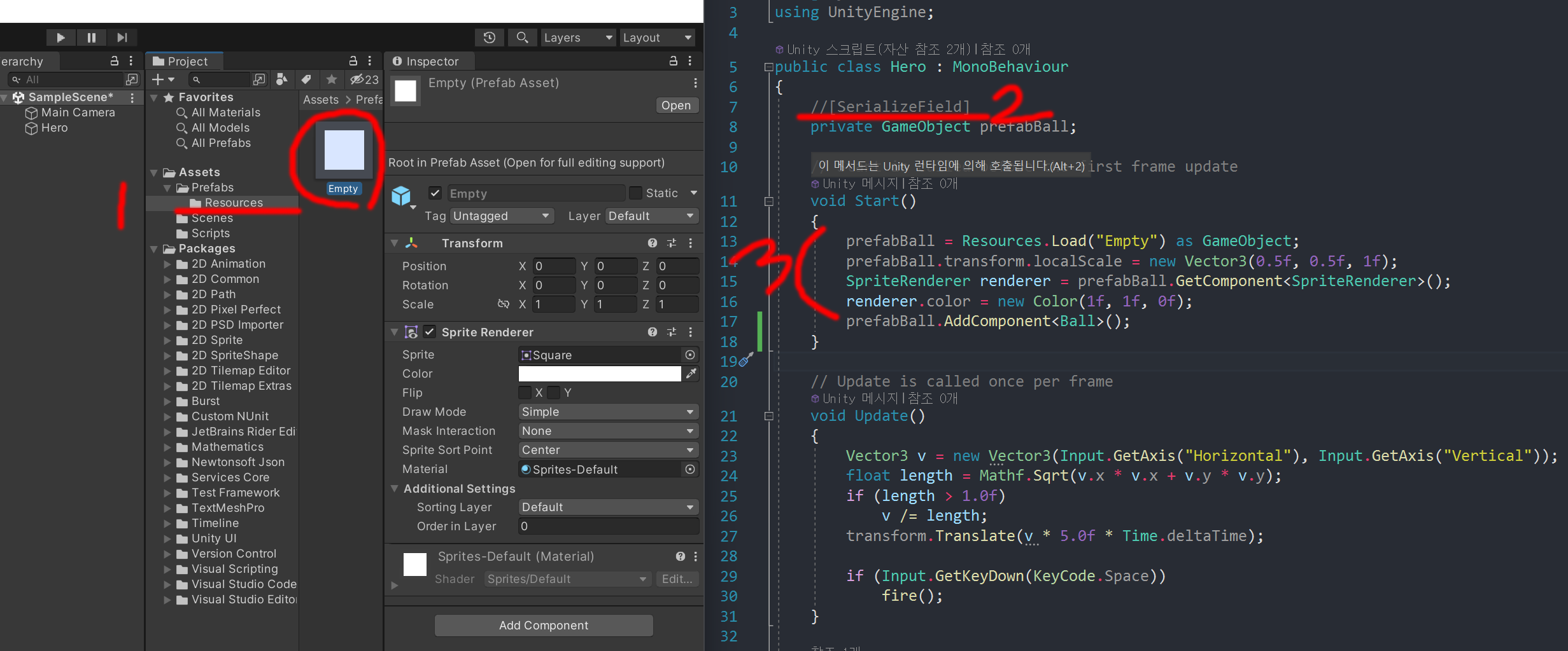 1. 객체 Hero를 만들고, 스크립트 파일(Hero.cs)을 추가한다.