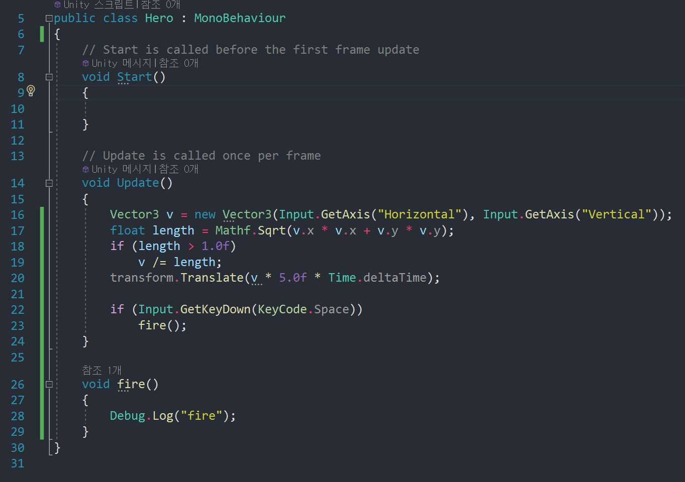 2. 스크립트 파일(Hero.cs)에 방향키를 누르면 움직이고, 스페이스를 누르면 총알을 쏘는 함수까지 추가한다.