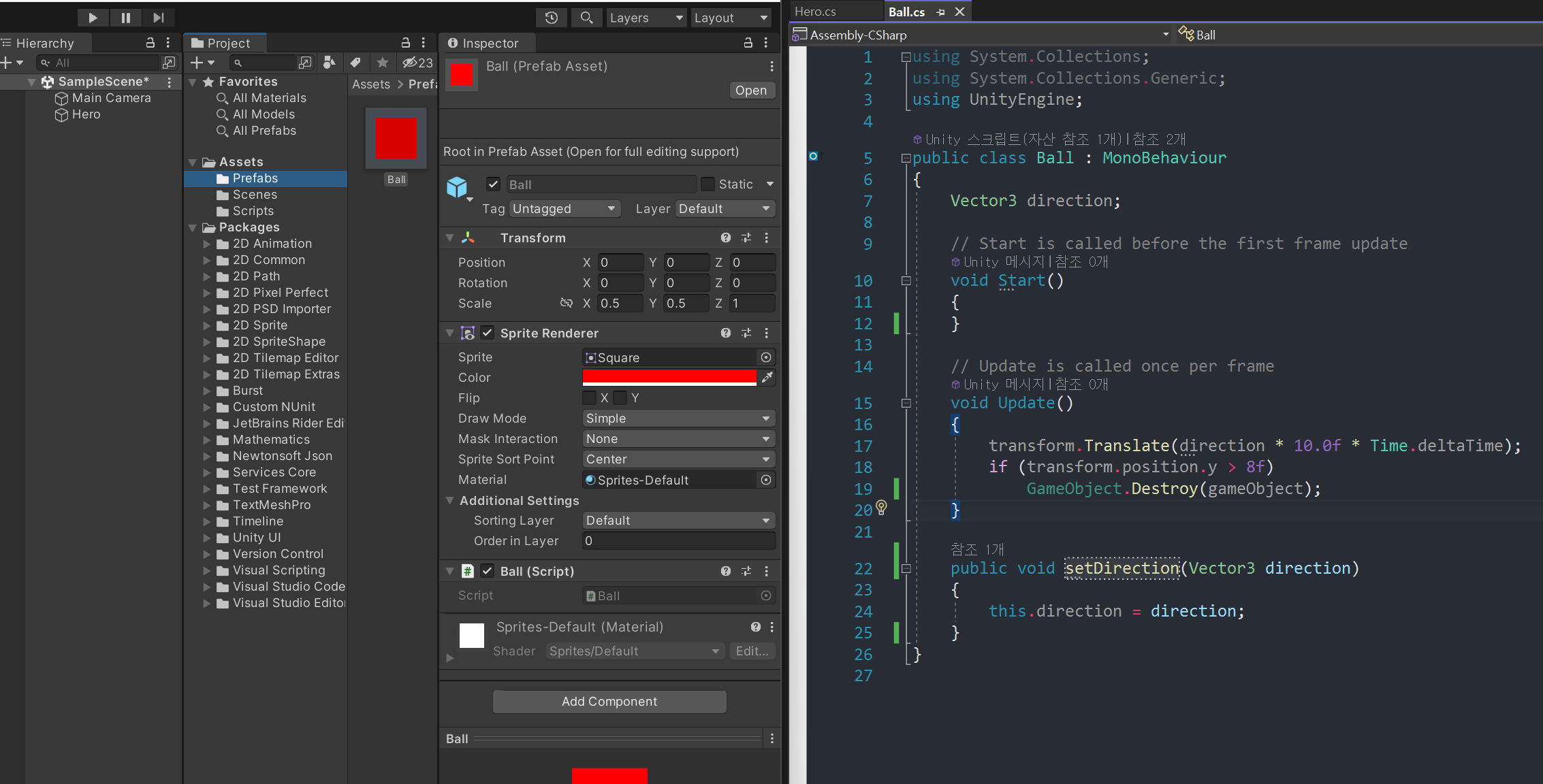 객체 Hero를 만드는것 처럼, Ball객체를 만들고, 스크립트 파일(Ball.cs)을 추가한다.