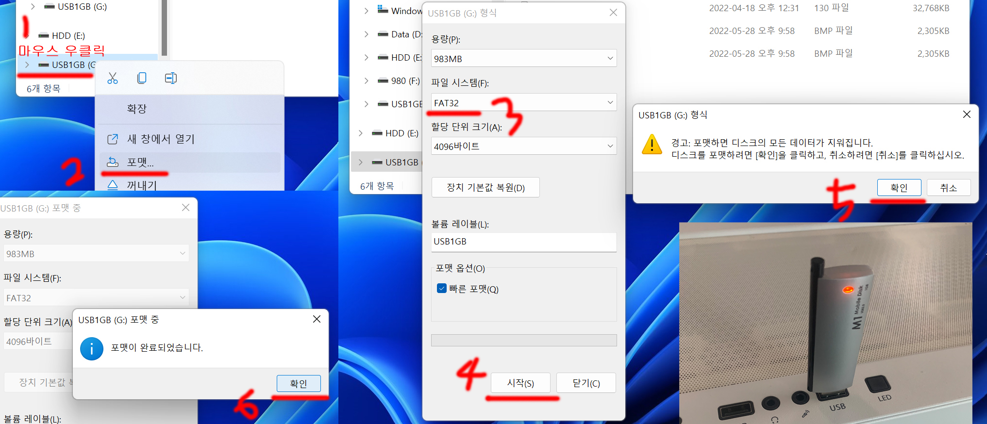 지워도 되는 USB메모리를 컴퓨터에 꽂은 후, 탐색기에서 순서대로 진행하시면 됩니다.