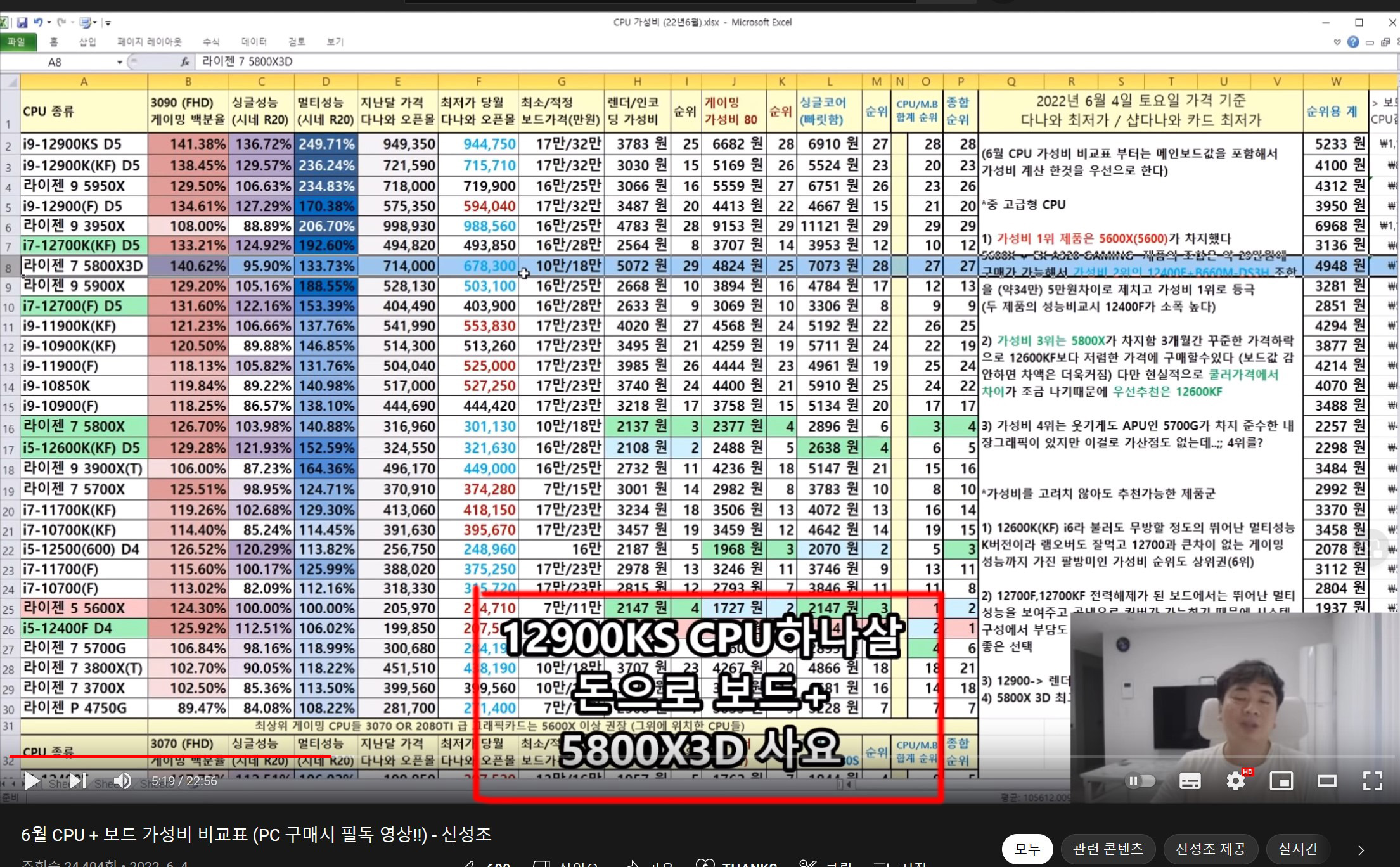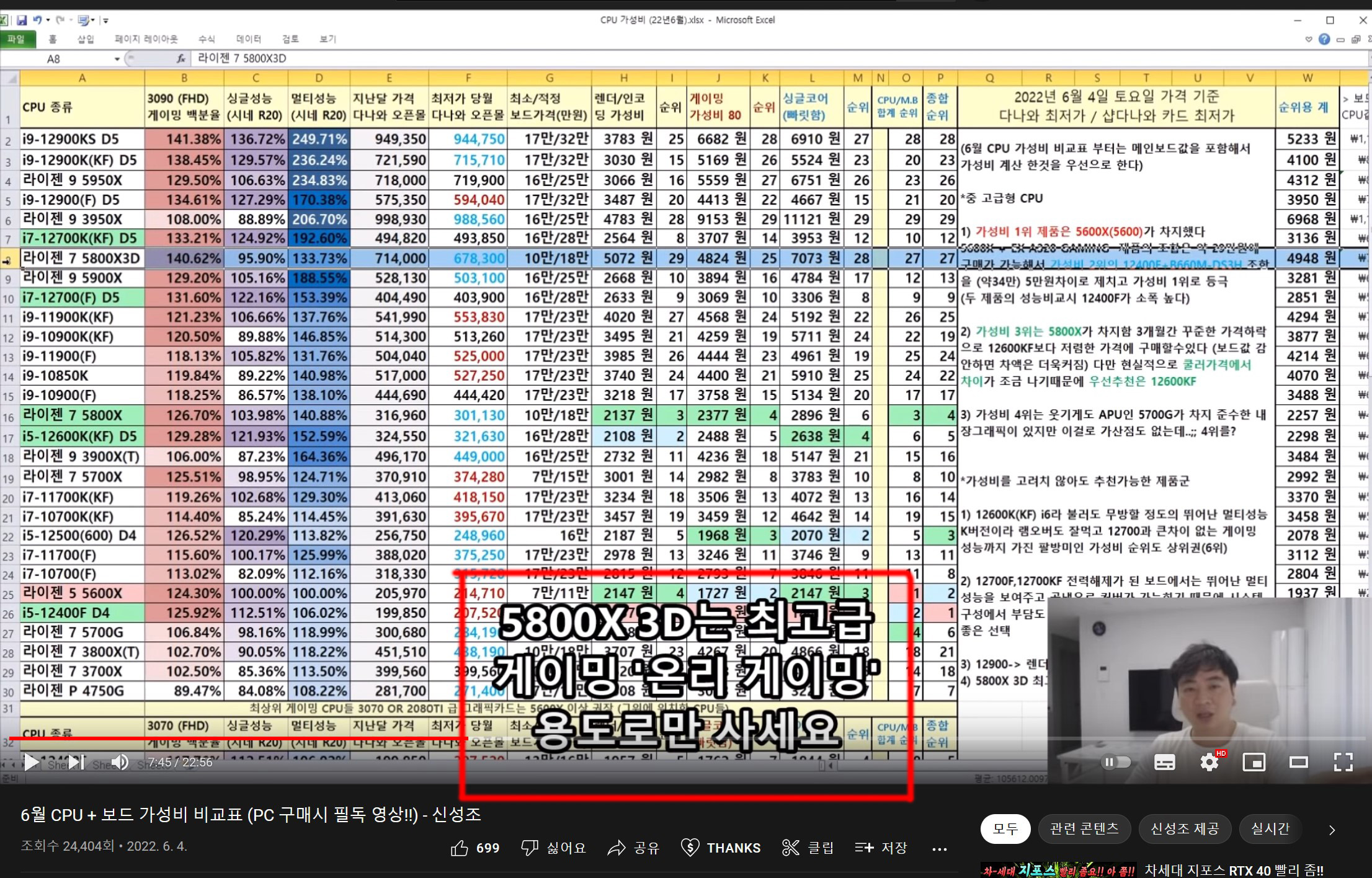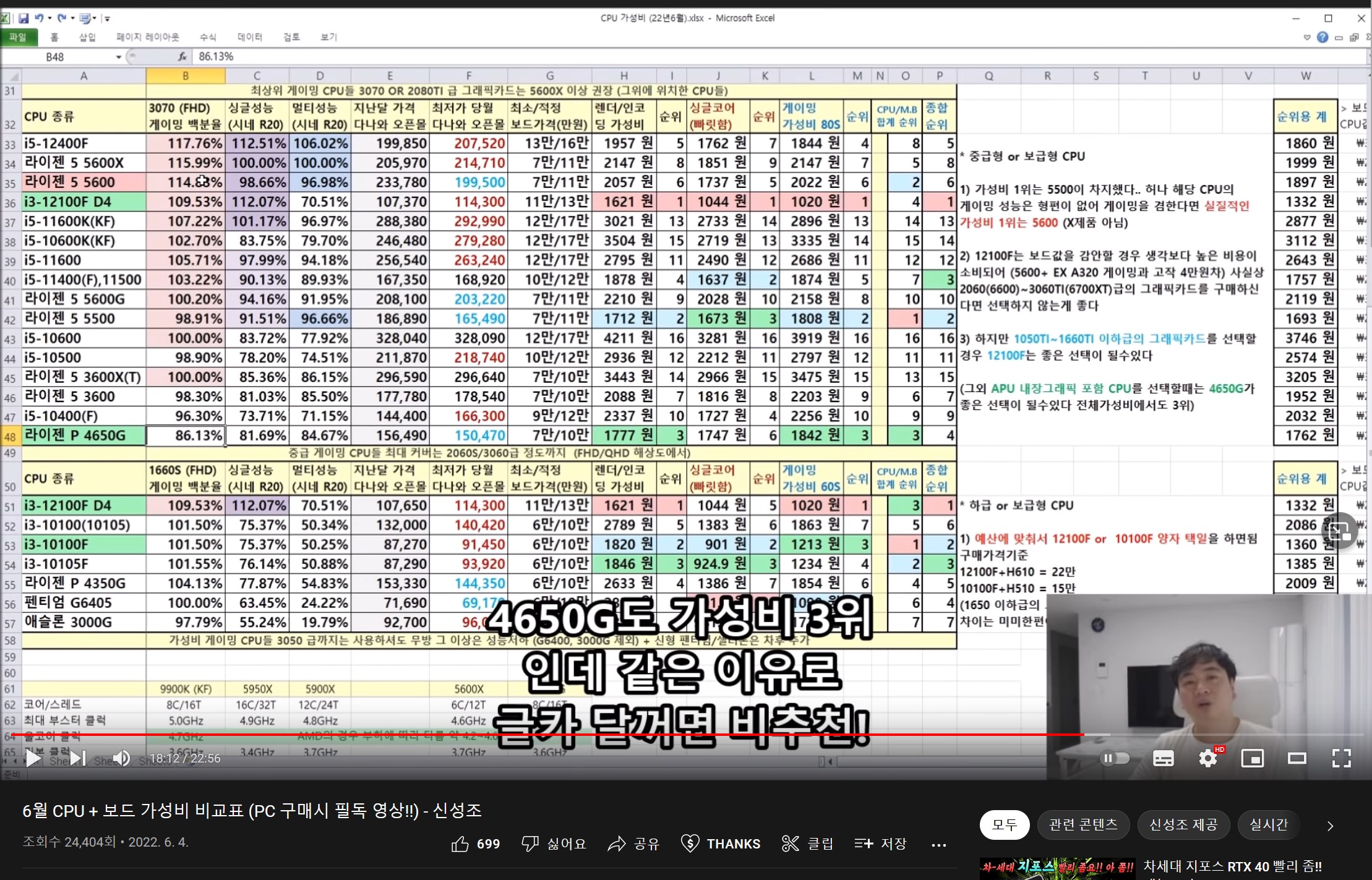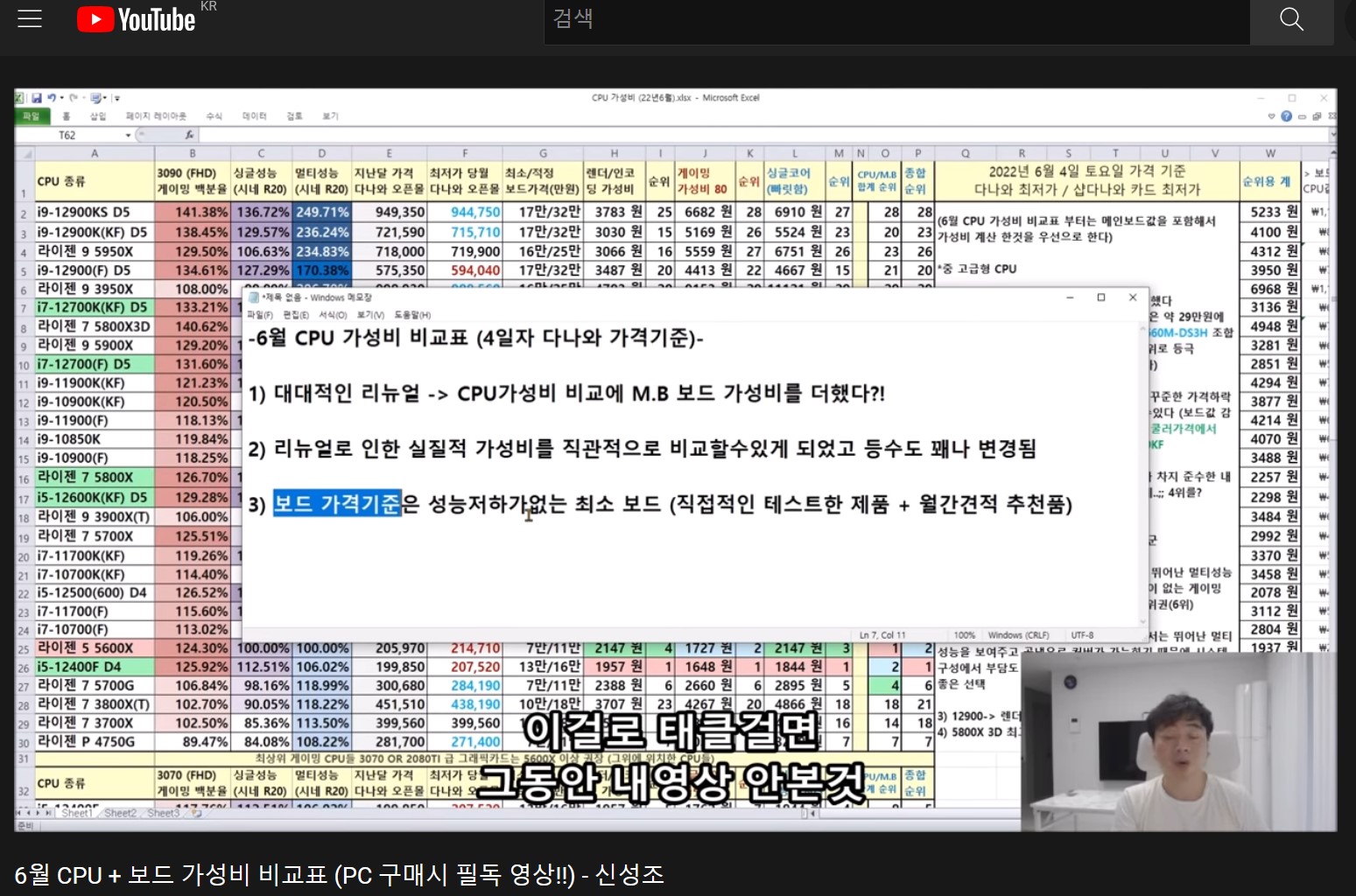출처 : 6월 CPU + 보드 가성비 비교표 (PC 구매시 필독 영상!!) - 신성조