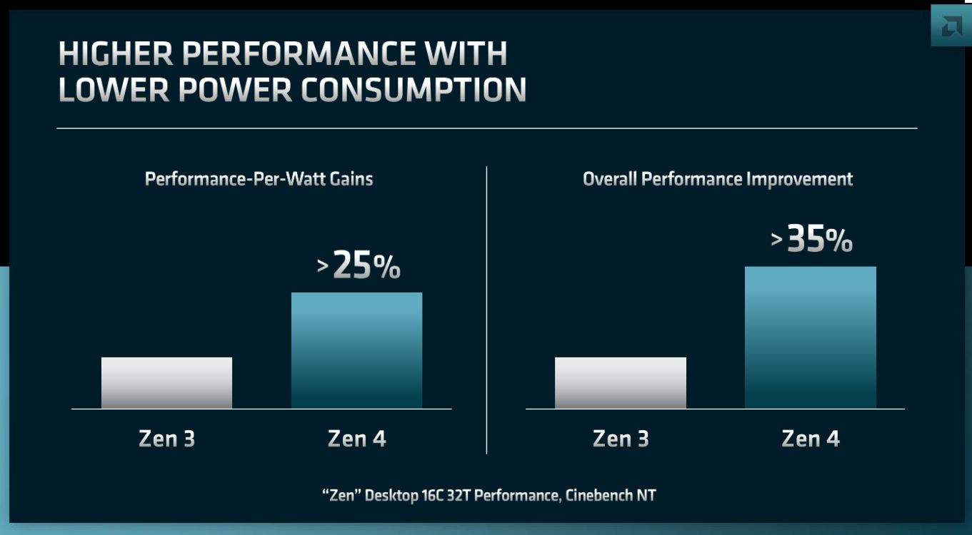 Mark Pepermaster는 또한 Zen4 아키텍처의 IPC가 8~10% 향상되고 15% 이상의 싱글 스레드 성능 향상을 제공한다고 확인하였습니다. 새로운 아키텍처는 Zen3 아키텍처에 비해 와트당 성능이 25% 이상 향상되고 전체 성능이 35% 향상되었습니다. 이 주장은 Cinebench 벤치마크를 기반으로 합니다.
