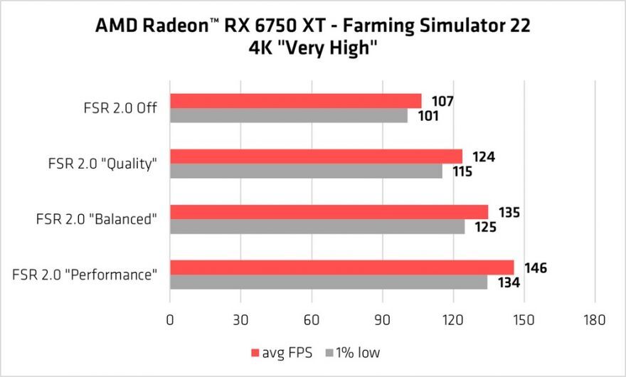 파밍 시뮬레이터 22에 대한 비교도 공유되었습니다. 여기서 AMD는 4K 해상도와 매우 높음 사전 설정으로 RX 6750XT 및 6650XT 모델을 사용하고 있습니다. Balanced 모드는 RX 6650XT 모델에 대해 100+ FPS 경험을 제공하고 Performance 사전 설정이 있는 6750XT에 대해 최대 146 FPS 평균 FPS를 제공합니다.