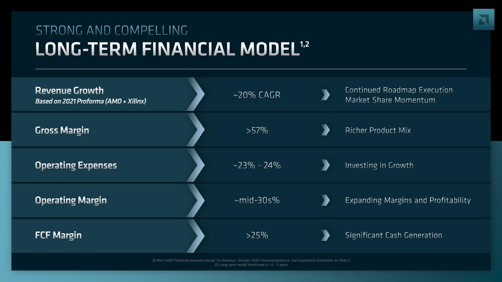 게다가 Xilinx의 인수가 완료되어, 이후의 매출을 크게 높여서, 재무 상황을 개선할 수 있는 목표를 세웠다는 것이 Su CEO의 설명이다. 이 결과로 Su CEO가 보여준 새로운 장기 재무 모델이 아래 이미지다.