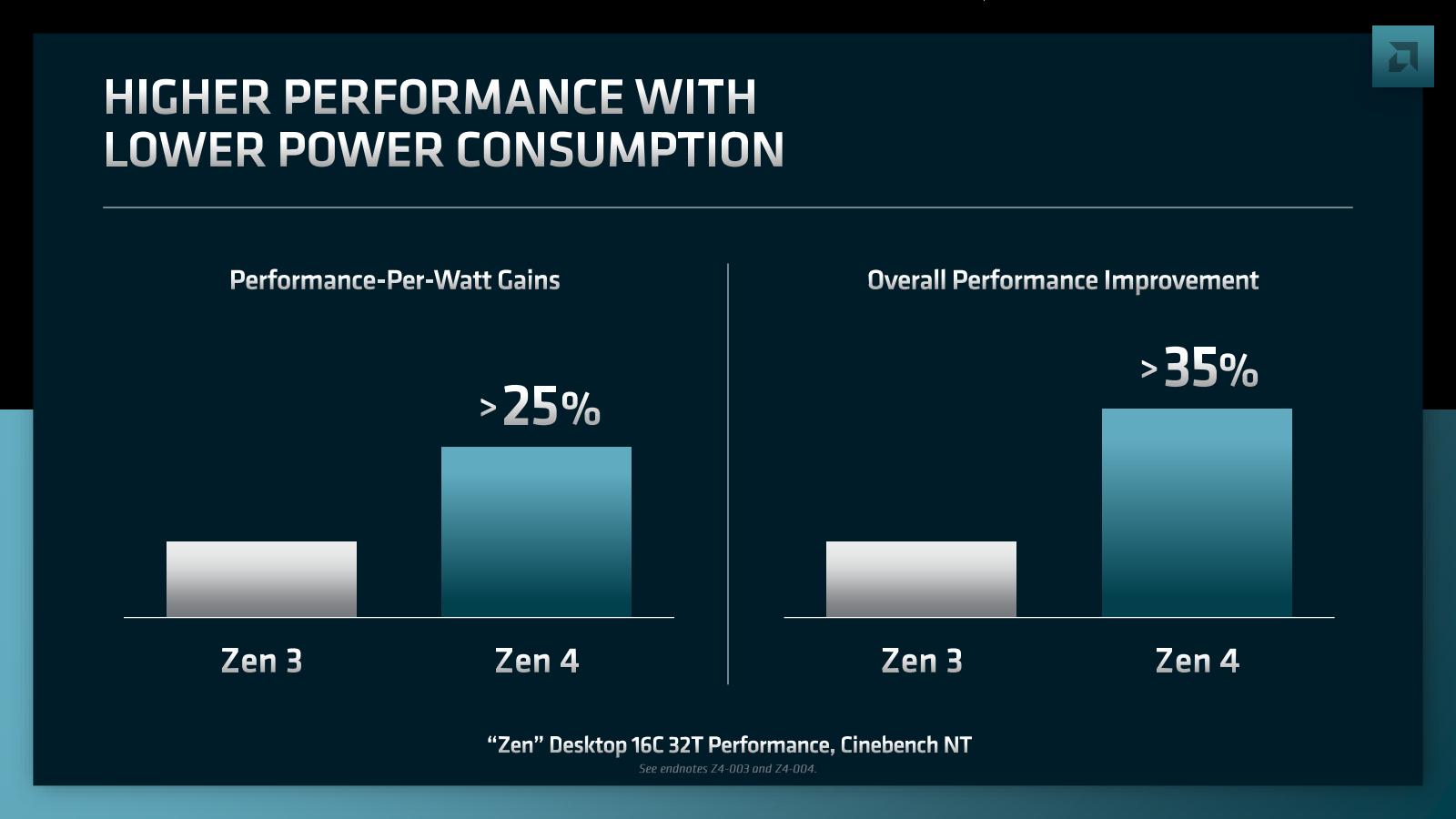 그런데 Zen 4에서는 성능이 35% 증가하고 전력 효율은 25% 향상되었다. 만일 소비 전력이 변하지 않는다고 하면, 전력 효율은 35% 향상되는 것인데, 실제로는 소비 전력 값 그 자체는 8% 정도 증가하고 있다고 생각된다. 즉 CineBench의 nT 작동 시에는 153W 정도다. 이것은 부스트 시의 값이므로 정격 TDP는 113.4W 정도가 된다는 계산이 된다.