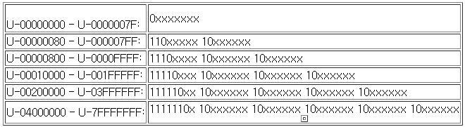 이것을 대표적인 인코딩 방식 UTF-8로 표현하려면 다음의 가변길이 코드 Map을 활용해야 한다.