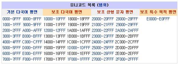 기본 2byte영역에 들어가는 부분이 기본 다국어 평면 영역이다.(이 코드 영역은 Window운영체제에서는 보조프로그램의 시스템도구의 문자표에서 확인할 수 있다) 이외 보조 다국어 평면이나 보조 상형 문자 평면이나 보조 특수 목적 평면과 같은 데이터 영역은 기본 다국어 평면에 다 담을 수 없는 기타 글자들을 위한 공간이다. 이 코드표를 활용해 문자를 표현하면 된다. 한글 영역과 기본적인 한자는 기본 다국어 평면에 다 들어가 있다. 보다 자세한 내용은 위키피디아나 유니코드 홈페이지에서 볼 수 있는데, 일반적으로 사용하는 경우 기본 다국어 평면 만을 대상으로 작업한다고 생각해도 무리가 없다.(없길 바라는게 정신 건강에 좋을 수도... 어려운건 아니지만 복잡한건 누구나 싫어하니까...)