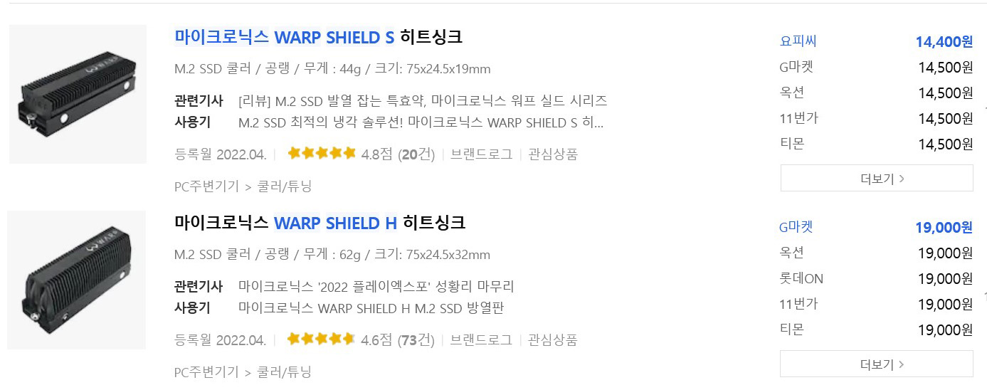 사용하는 환경에 따라 다르기는 하겠지만, 이 정도의 온도 차이라면 소중한 저장공간이 있는 M.2 SSD를 보호하는 차원에서 방열판을 설치하는 것은 필수적으로 보입니다. 용도에 따라 크고 작은 방열판을 선택하면 되겠지만, 리뷰를 작성하는 시점에서 다나와 최저가격이 5천원 차이인데, 조립시 높이 간섭만 없다면 마음 편안하게 마이크로닉스 WARP SHIELD H 히트싱크를 추천합니다.