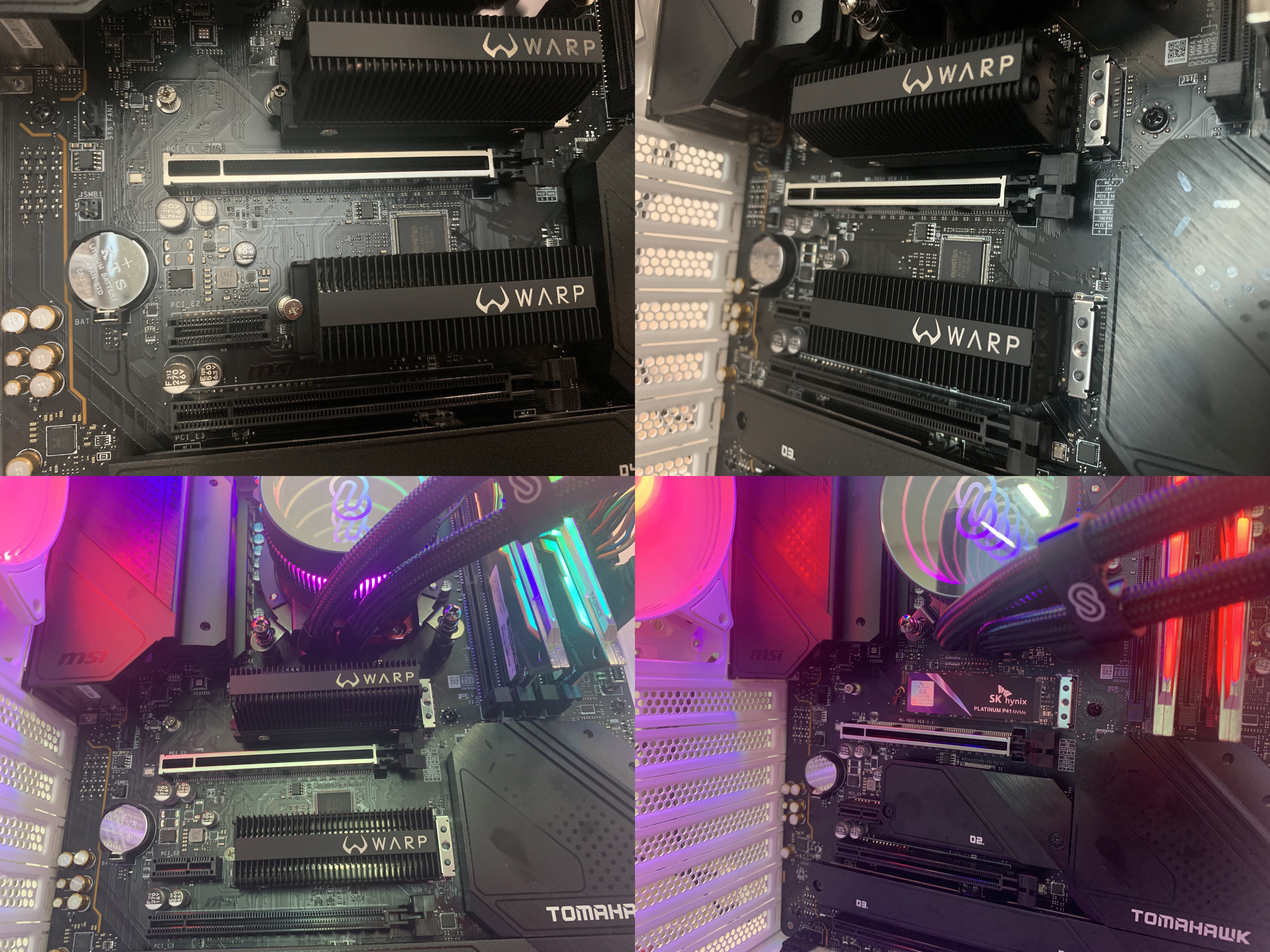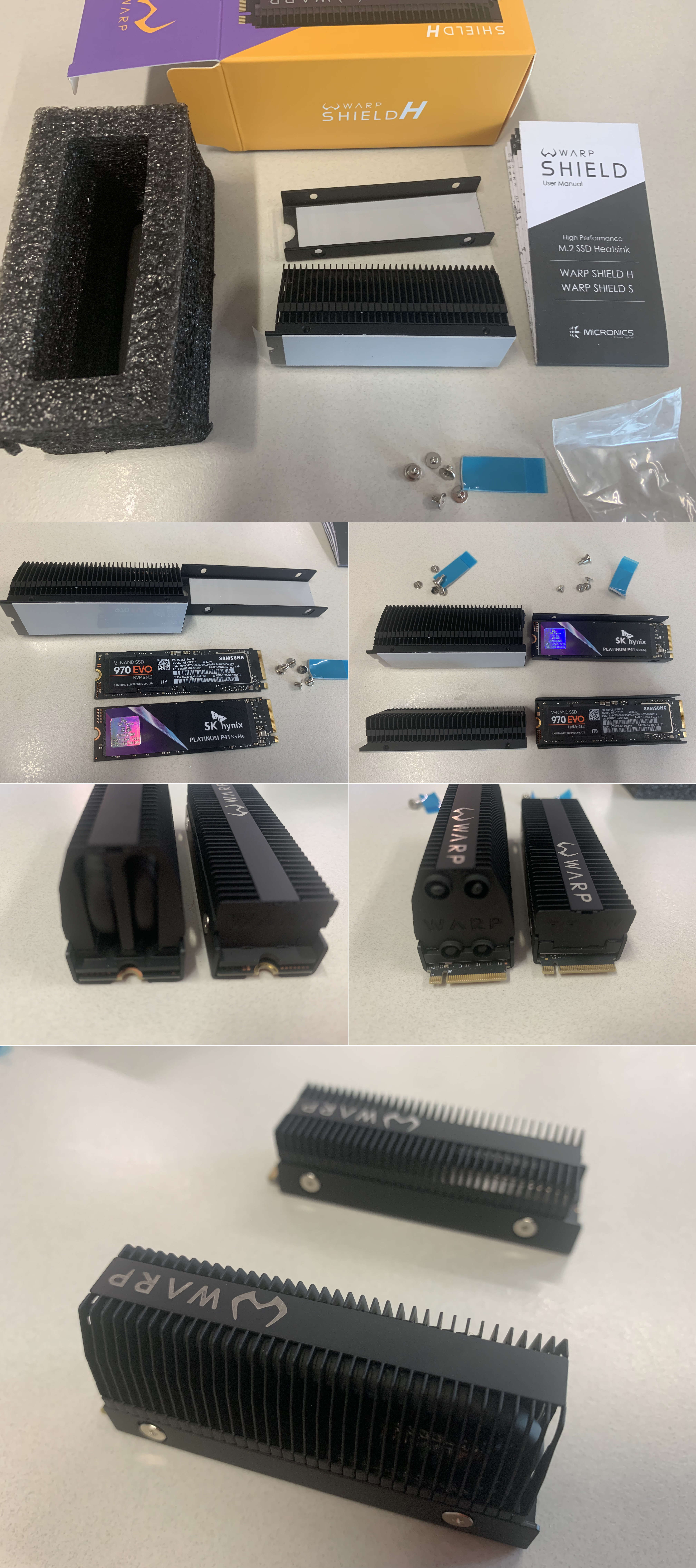 위 슬롯에는 마이크로닉스 WARP SHIELD H 히트싱크, 아래 슬롯에는 마이크로닉스 WARP SHIELD S 히트싱크입니다.