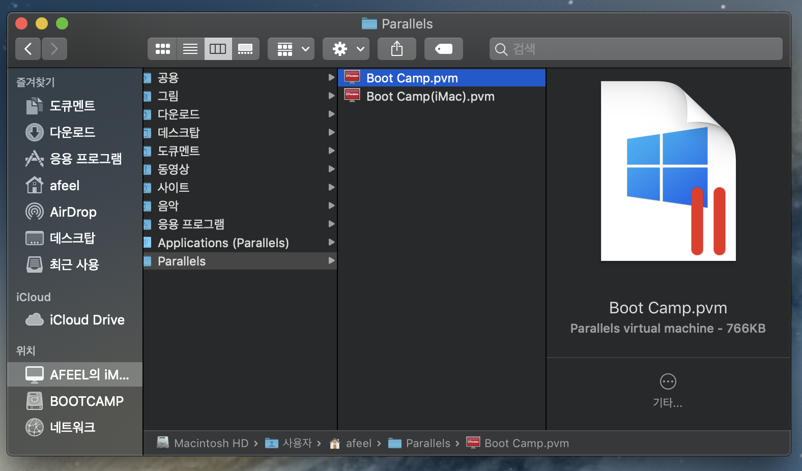 용량을 보면 이전 글에서 만든 Boot Camp.pvm는 766kb 이며, 이번 글에서 만든 Boot Camp(iMac).pvm은 92.26GB 다.