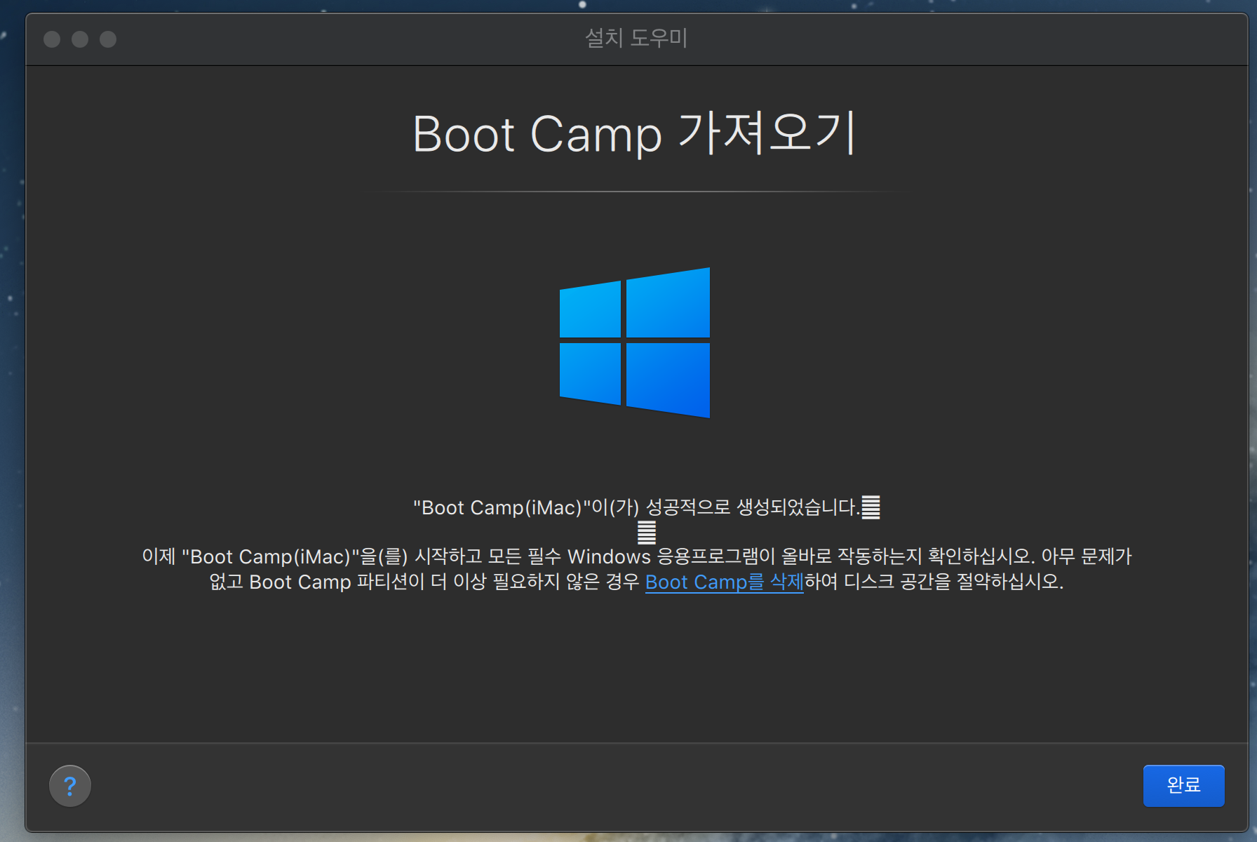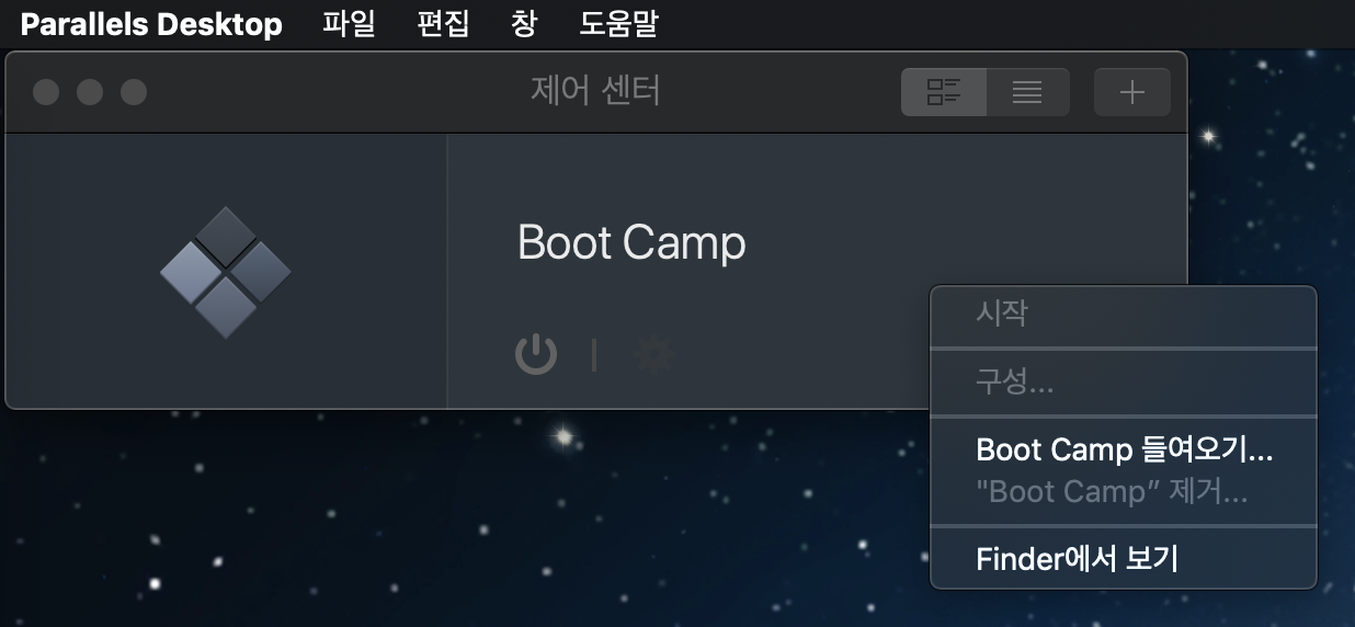 제어센터에서 [마우스 우클릭], [Boot Camp 들여오기]를 클릭 한다. 그 다음 원하는 이름 입력한다.