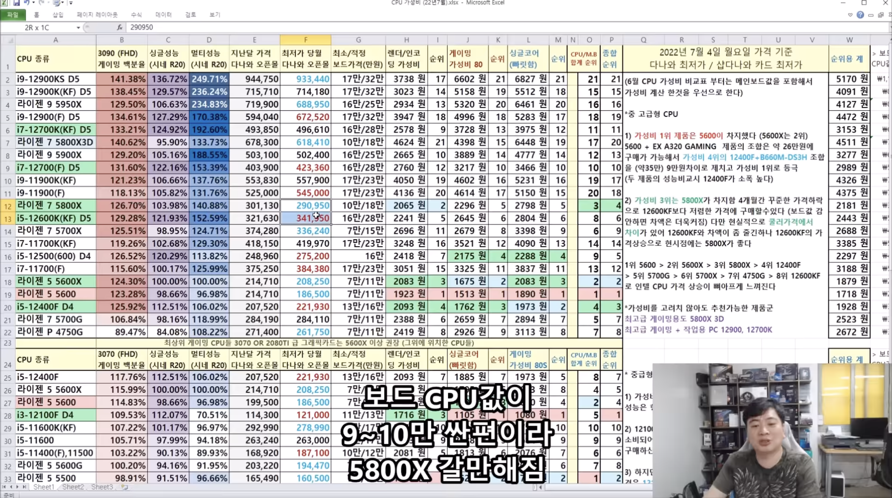 이번 7월에는 지난 6월 대비, 라이젠 7 5800X가 가격이 내려 29만원, i5-12600K는 가격이 올라 34만원.