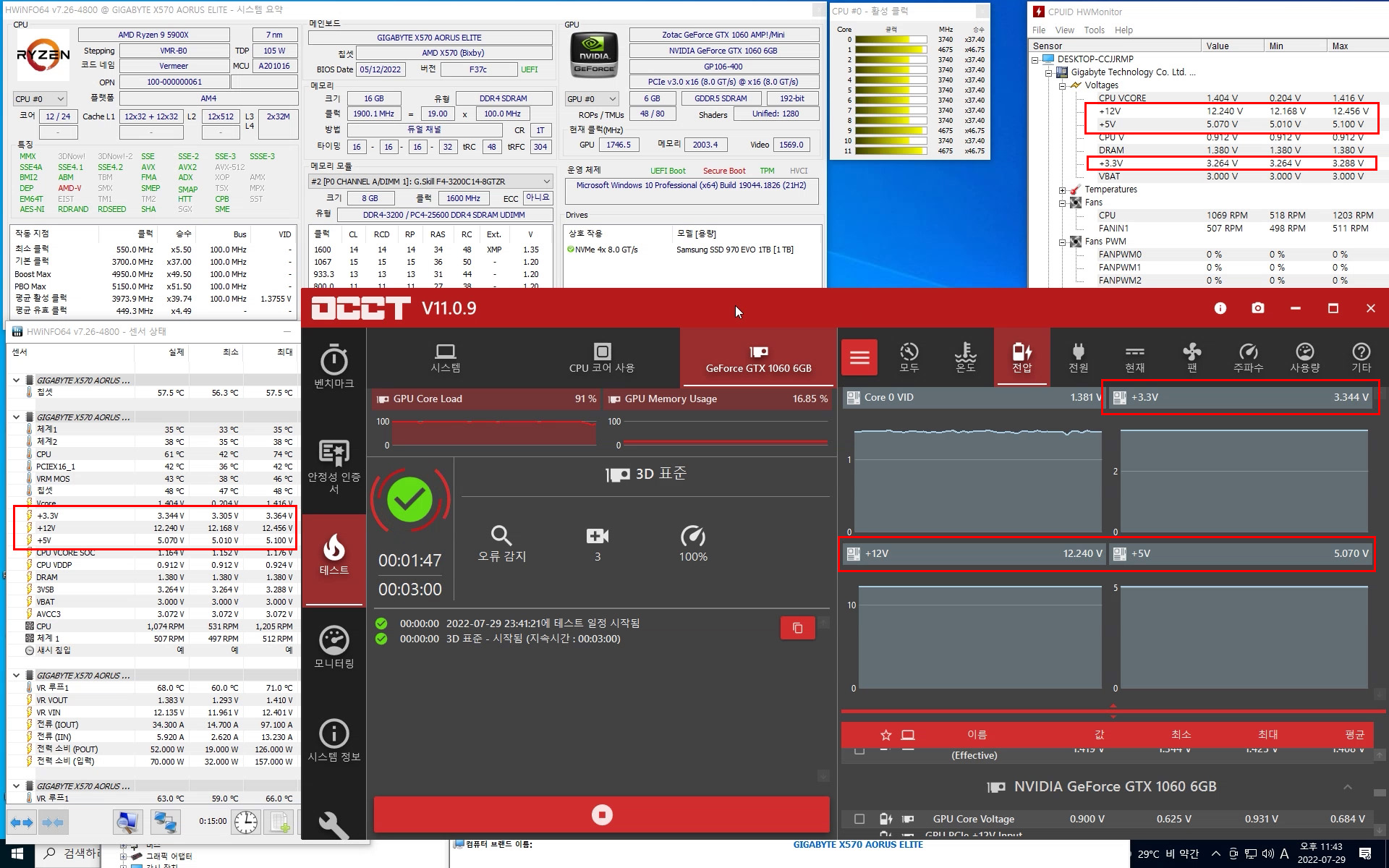 두번의 실험을 했습니다. 첫번째는 CPU 5900X 풀로드, 두 번째는 GTX 1060 6G 풀로드시 촬용을 했습니다.