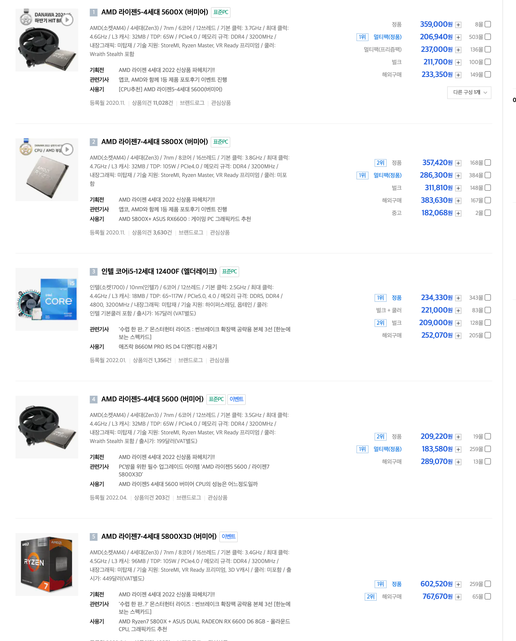 출시 초기에 비해서 정말 가격이 저렴해졌습니다. 반면 인텔 CPU는 가격이 상승했습니다.