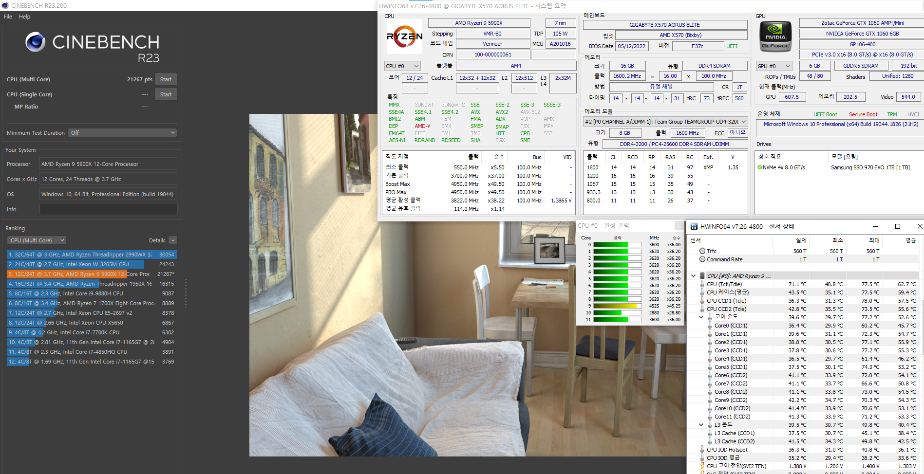라이젠9 5900X는 12코어 24쓰레드로 시네벤치 R23 멀티 벤치를 테스트 발열량이 상당히 높습니다.