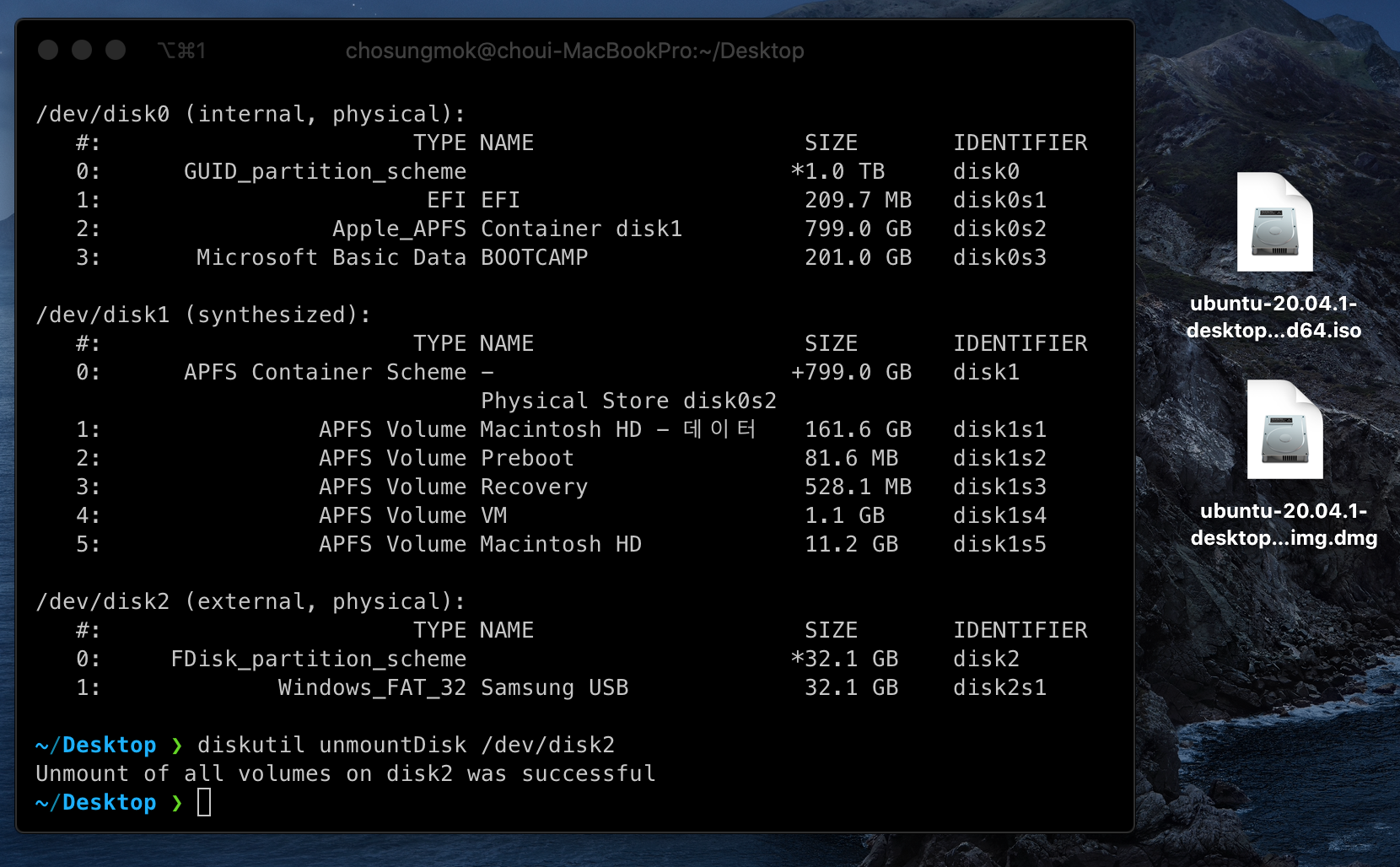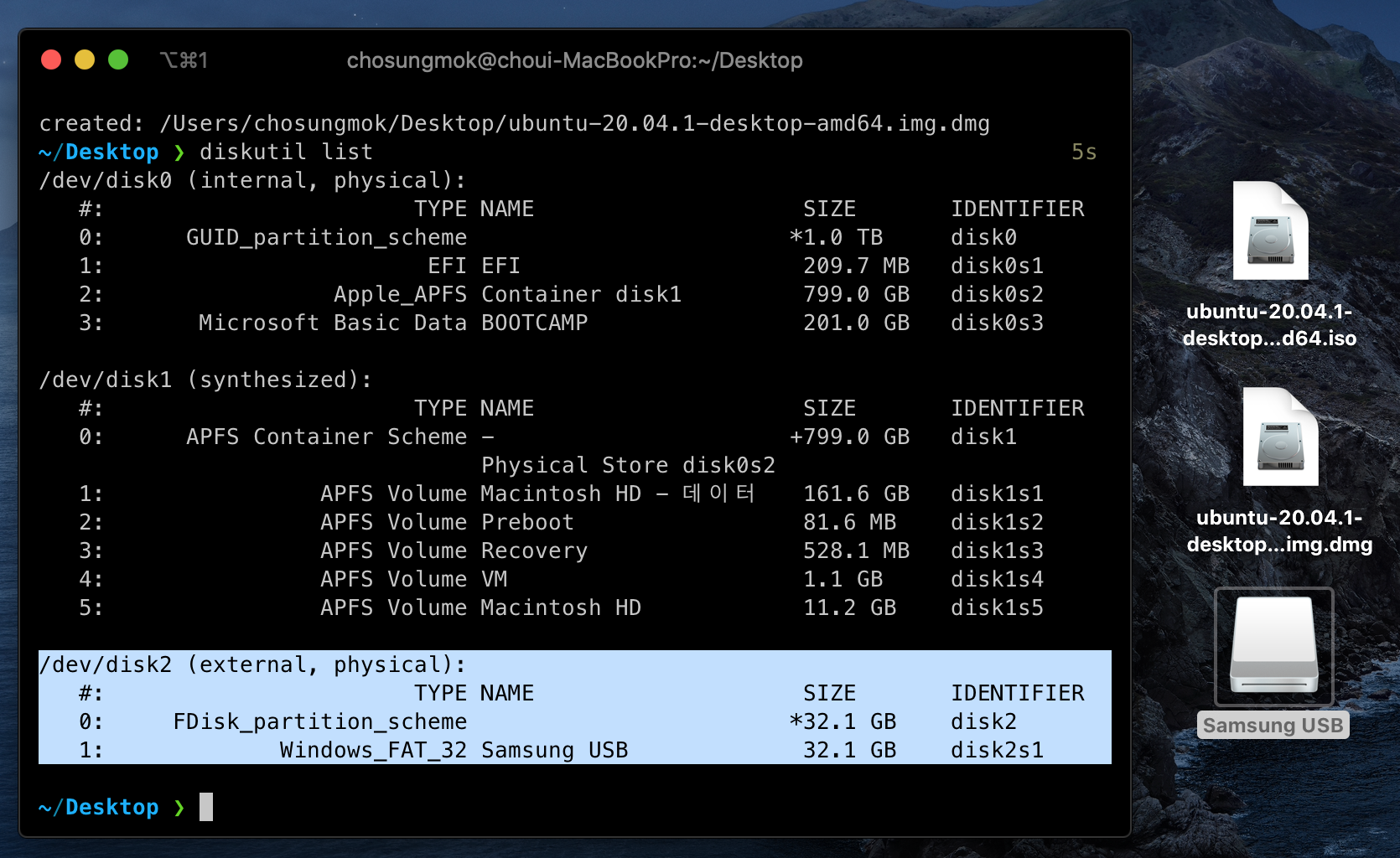 디스크의 이름을 확인하자. 지금은 /dev/disk2가 나온걸 알수 있다.