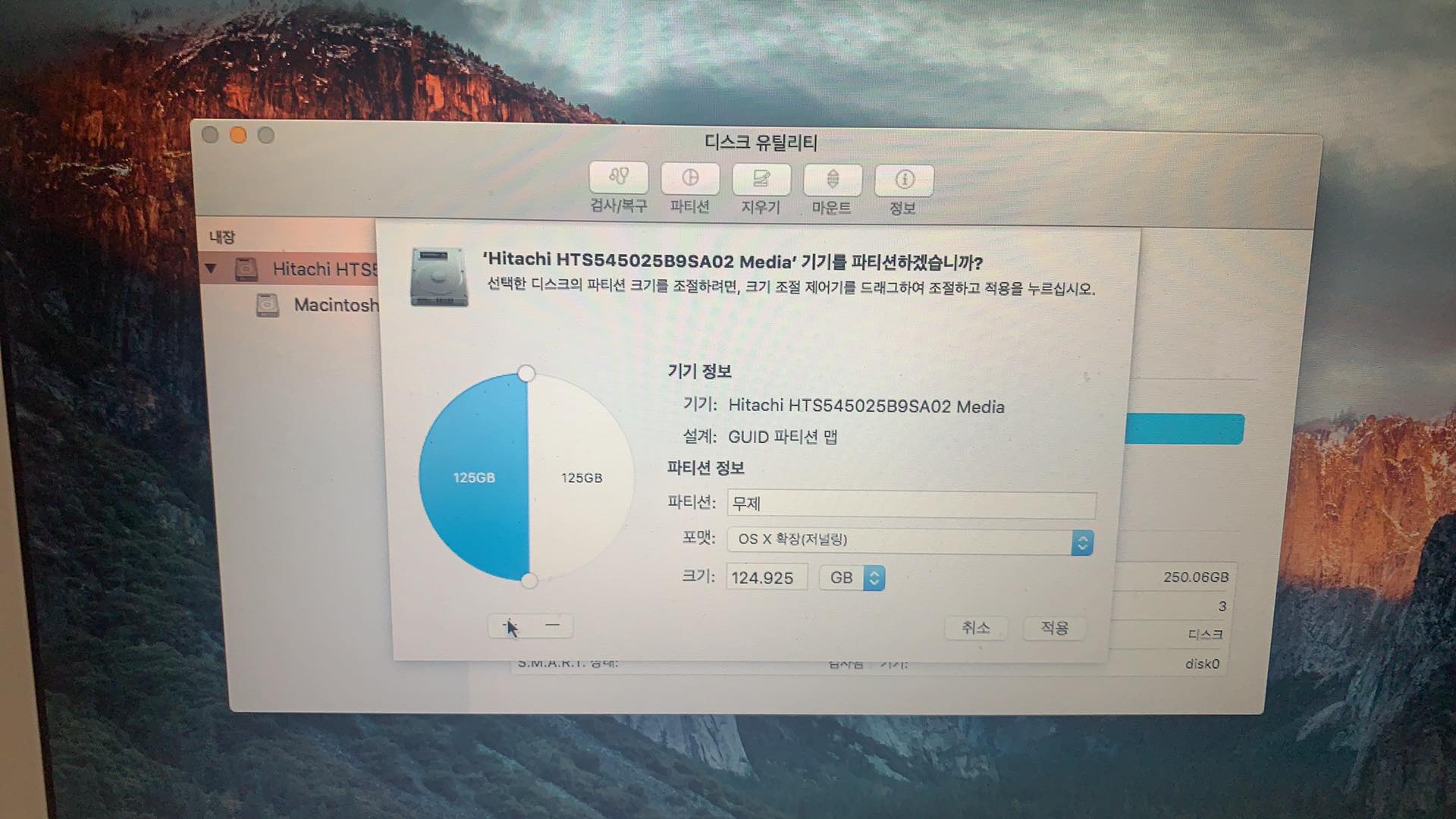 멀티부팅하니까 파티션 쪼개기... (다음글에 관련내용 자세히 있음. 파티션을 쪼개기 보다는 맥 사용공간만 줄여도 됨)