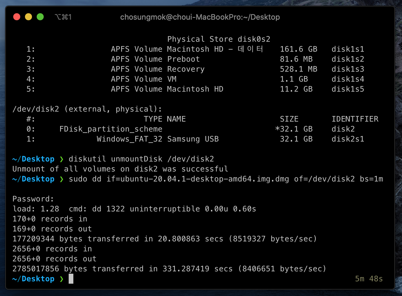 iso, img.dmg 둘다 2.79gb가 밖에 안된다. 대략 4gb이상의 usb를 꽂아서, 명령한다.
