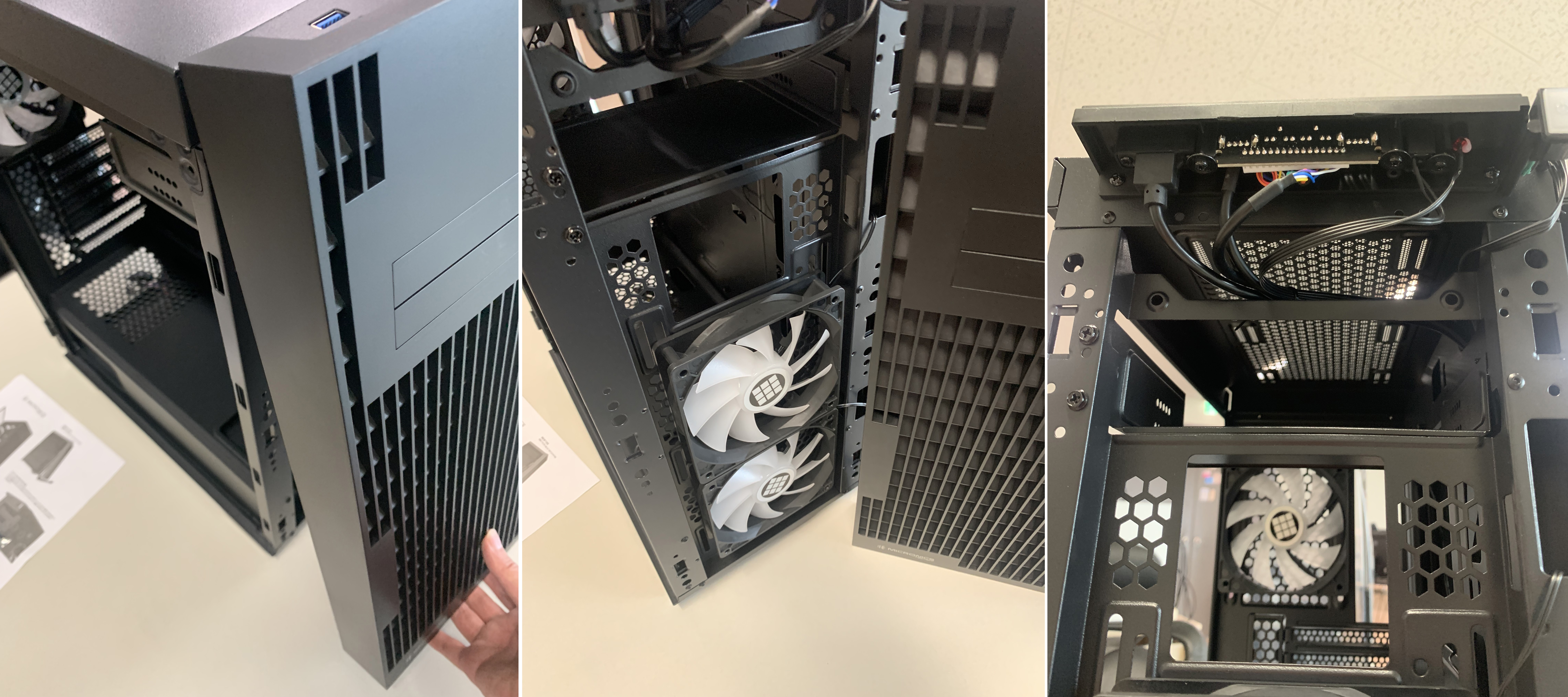HDD 조립할때 나사가 필요없어서 조립이 편했고, 선정리가 쉽도록 구석구석의 장치들, 무엇보다 앞뒤가 시원하게 타공 되어 있어 강력한 팬으로 쿨링이 극대화 되어 있습니다. 특히 ODD가 필요한 분에게 찾기 힘든 케이스로 좋은 선택지가 될거 같습니다. 집에서 게이밍 겸 교육용으로 괜찮을 같고, 전문가용으로 손색이 없는 케이스입니다.