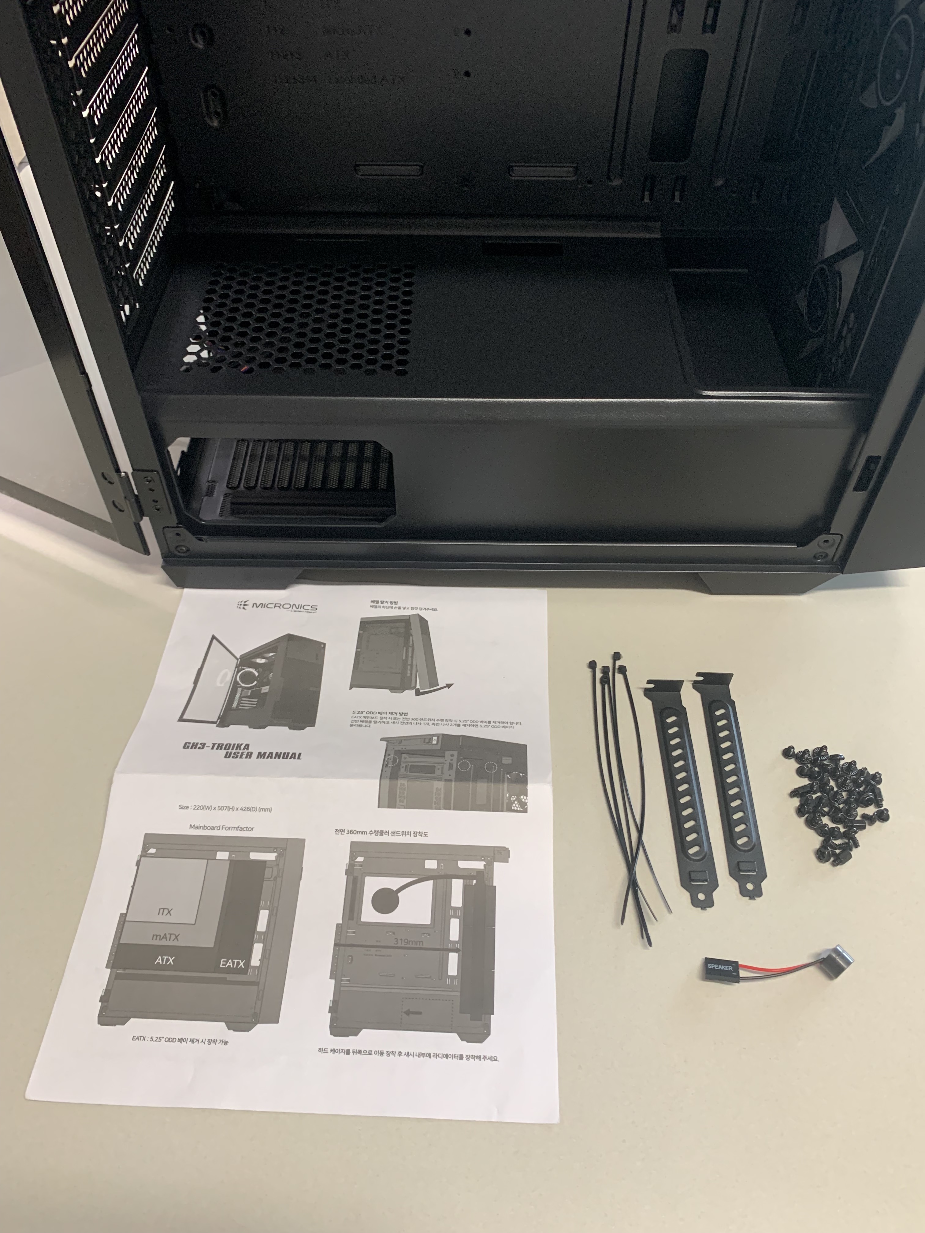 제품 설명서와 조립시 필요한 나사와 타이가 넉넉하게 있고, 컴퓨터 점검시 상태를 알려줄 비프음 스피커가 보이며, 외장 그래픽 카드를 사용하다 CPU 내장 그래픽 카드로 변경시 빈 슬롯을 채울 여분의 슬롯까지 포함되어 있습니다.