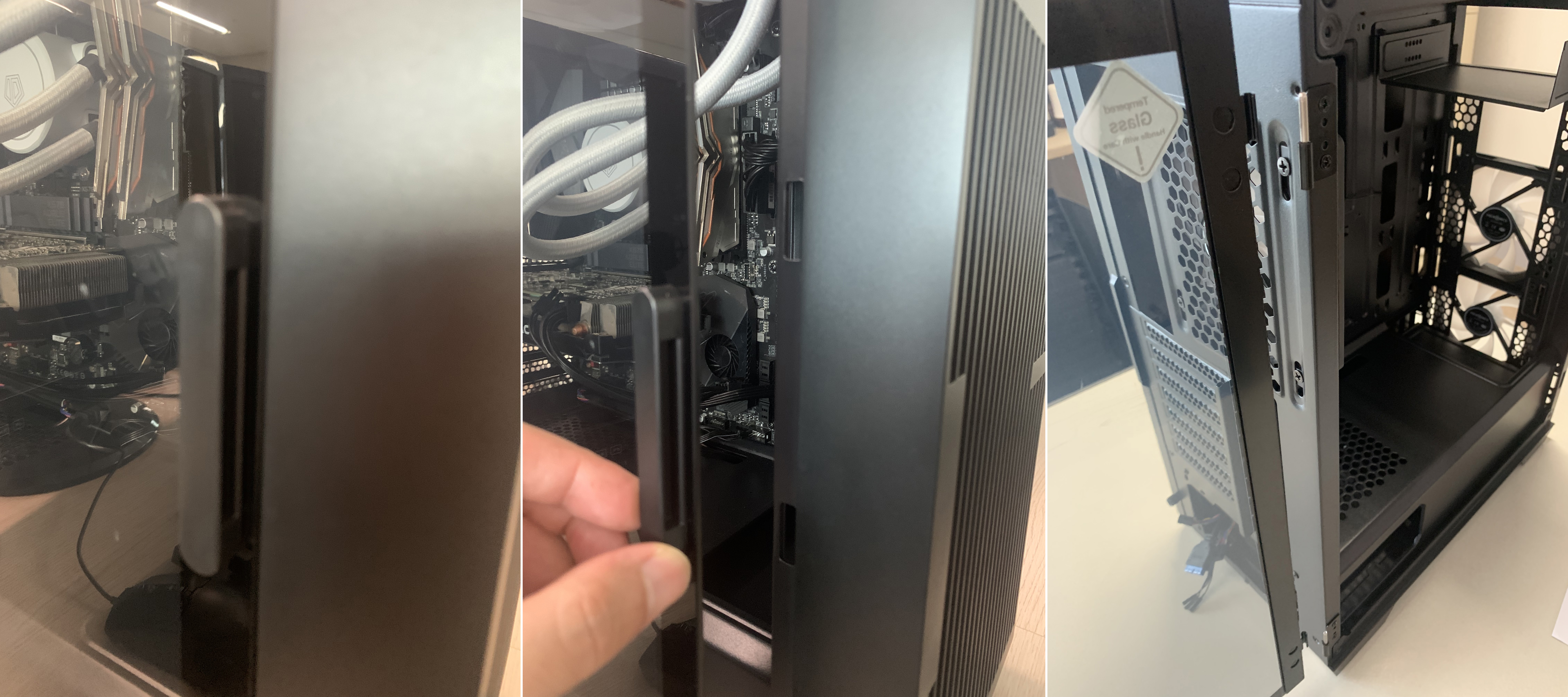 측면 강화유리는 힌지 도어 방식을 채택해서, 쉽게 여닫을 수 있는 플라스틱 손잡이가 있습니다.