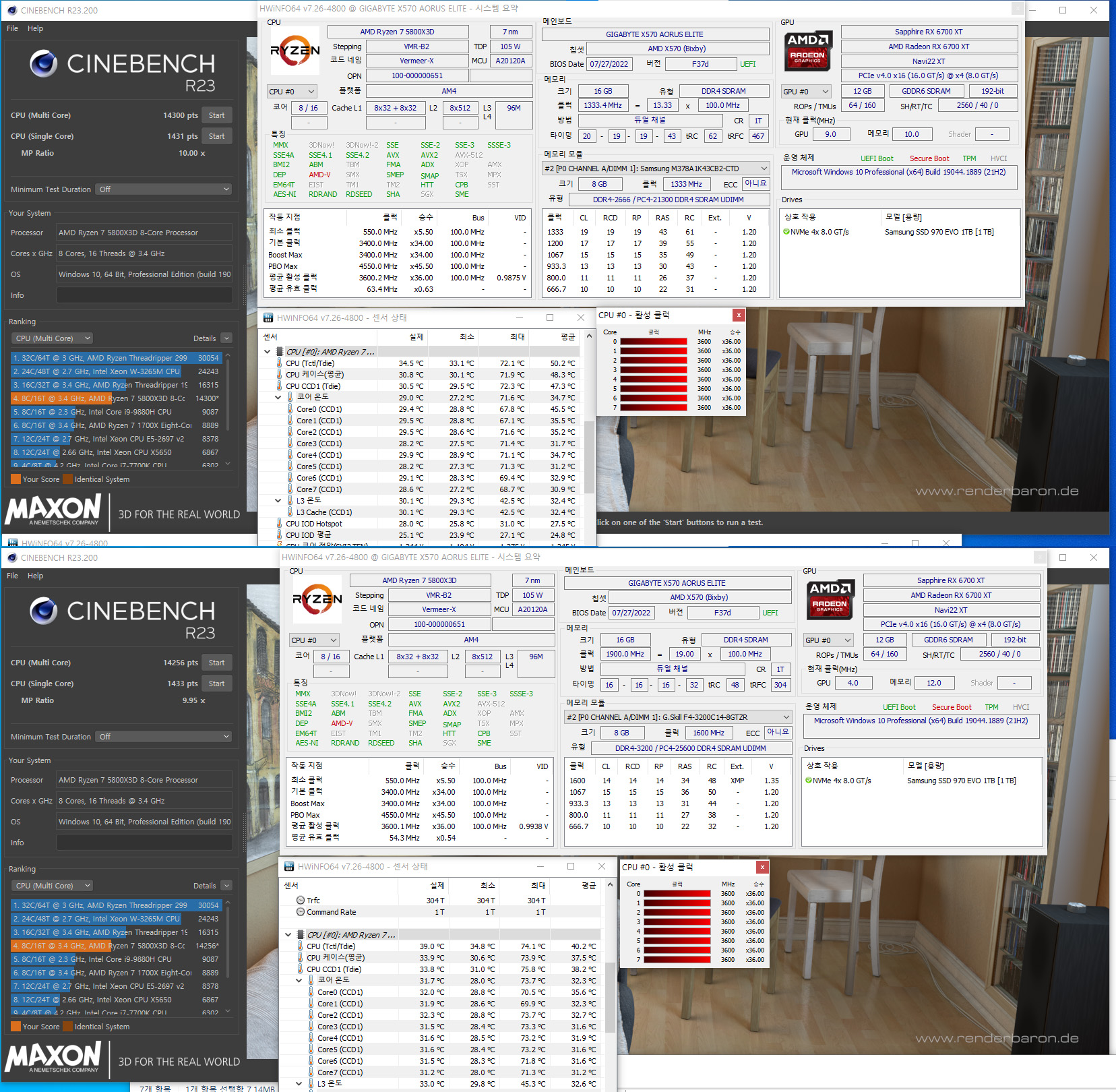 워낙에 유명하고 좋은 CPU 5800X3D라 조금만 검색하면 쉽게 고급 정보들을 확인할 수 있습니다. 그래서 저는 흔한 필드 테스트를 피하고 그 빈틈을 노려, 삼성 시금치 램(2666클럭 기본)과 지스킬(3800클럭 CL16-16-16-32) 램의 오버클럭 정도에 따라 성능에 어떤 영향을 미치는지 비교하며 진행했습니다.