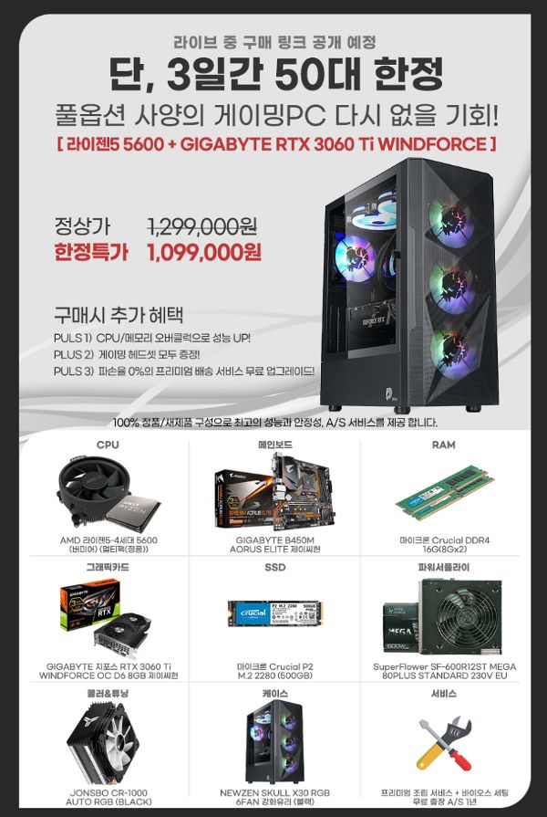해당 제품은 유튜브 라이브 중 구매 링크가 공개될 예정이며, 권장소비자가 대비 200,000원 할인된 가격으로 구입이 가능하다. 또한, PC를 구입하는 모든 고객님들을 대상으로 AMD장패드, 게이밍 헤드셋을 사은품으로 제공된다.