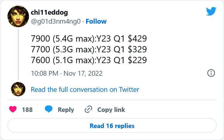 Ryzen 9 7900은 이전 유출에서 언급되지 않은 새로운 제품입니다. 새로운 정보에 따르면 이 모델은 12개의 코어를 갖추고 최대 5.4GHz의 부스트 클럭을 제공하므로 X 모델보다 200MHz 더 느립니다. 이 CPU의 가격은 120달러 저렴한 429달러라고 합니다.