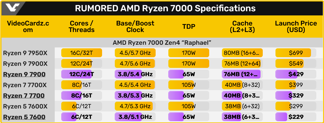 AMD는 Ryzen 9 7900, Ryzen 7 7700 및 Ryzen 5 7600 SKU의 세 가지 제품을 출시할 것이라고 합니다. 이러한 모델과 기존 모델의 주요 차이점은 기본 전력이 170W에서 65W로 제한된다는 것입니다.