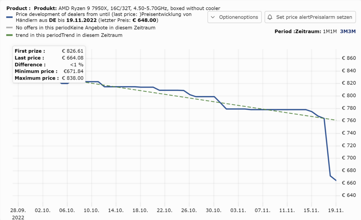 유럽의 일부 소매업체는 Ryzen 7000 시리즈를 180유로 이상 할인하기 시작했습니다. 그런 다음 플래그십 Ryzen 9 7950X는 2개월도 안 되어 849유로에서 669유로로 대폭 인하되었습니다. 이러한 가격은 USD에서 EUR로 직접 변환하는 것보다 훨씬 낮습니다.