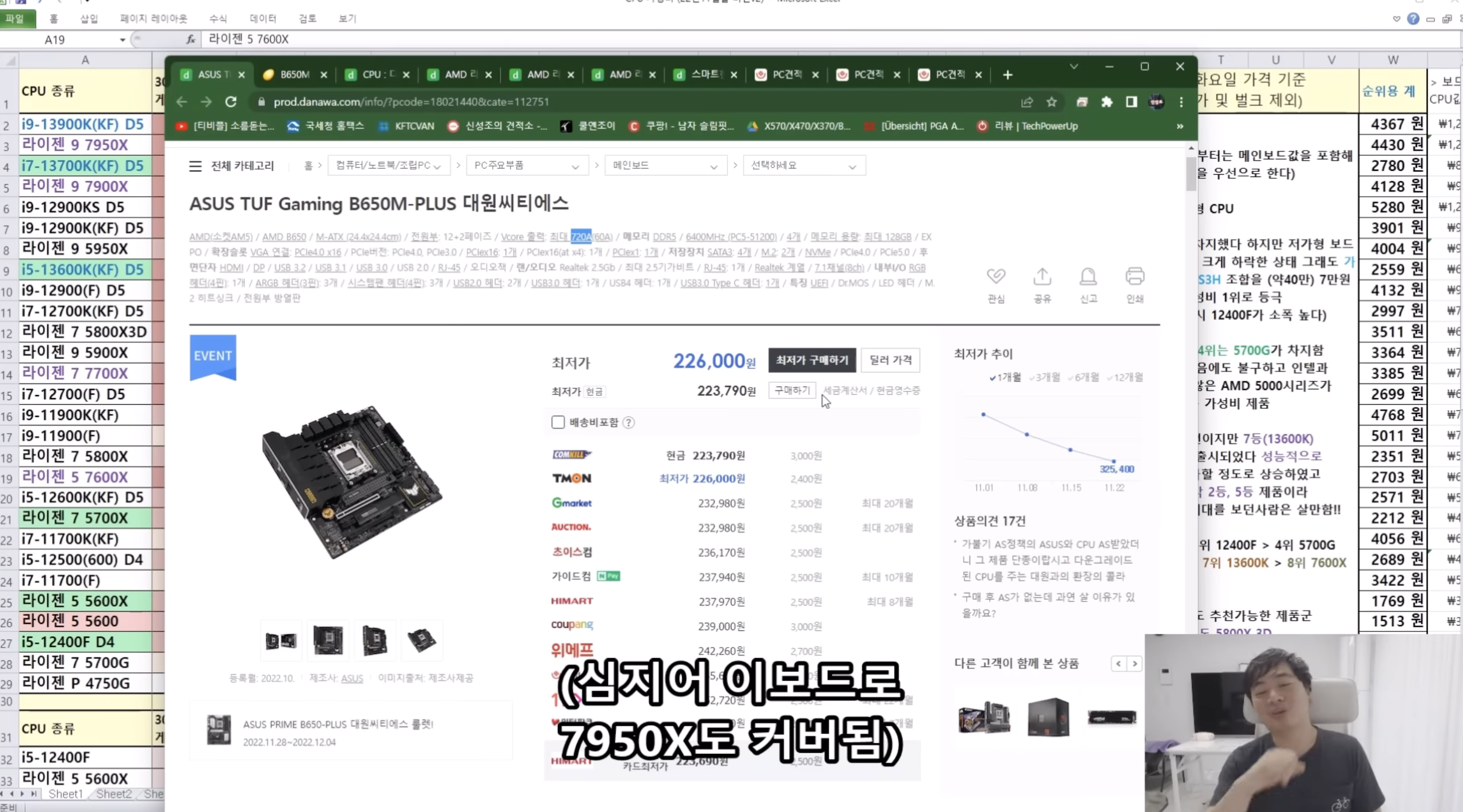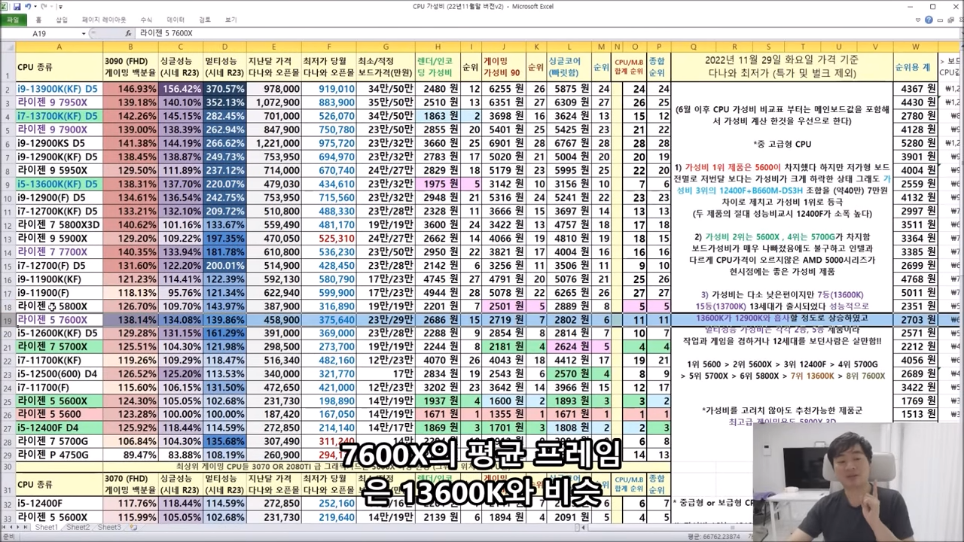 이번에 가격이 내려서 7600X가 13600K(F) 대비 6만원이나 저렴한데, 게임상에서는 성능이 비슷하게 나오고 있습니다.