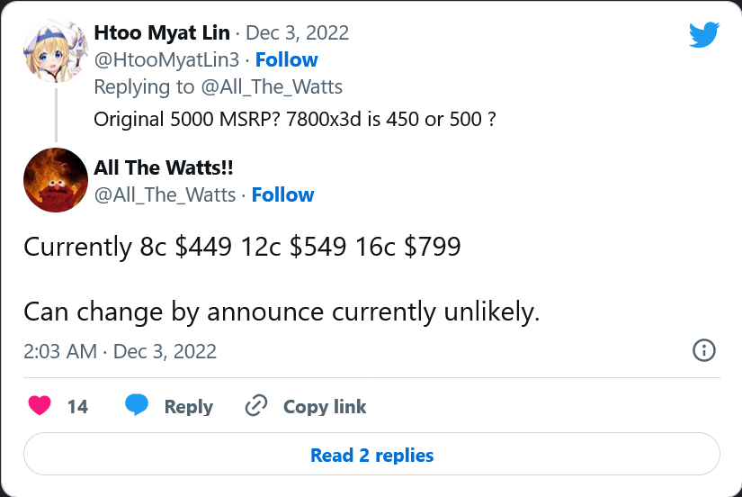 Twitter의 @All_The_Watts에 따르면 3D V-Cache CPU는 평면 CPU와 동일한 비용이 듭니다. Ryzen 7 7800X3D는 $449 , 7900X3D는 $549 , 7950X3D는 $799 로 가격이 책정 되어 Core i7-13700K, i9-13900K 및 13900KS의 직접적인 라이벌이 될 것으로 알려졌습니다.