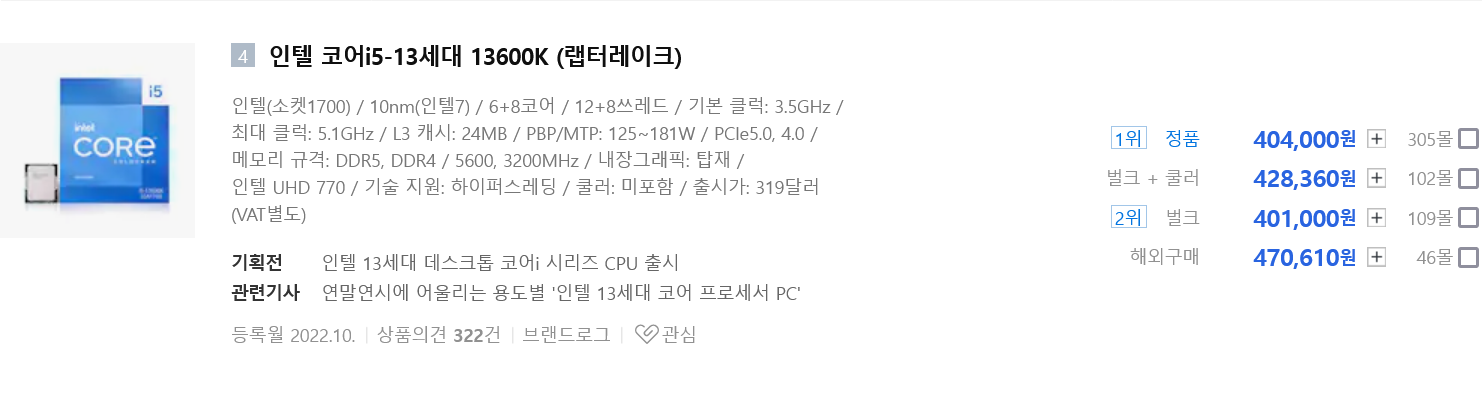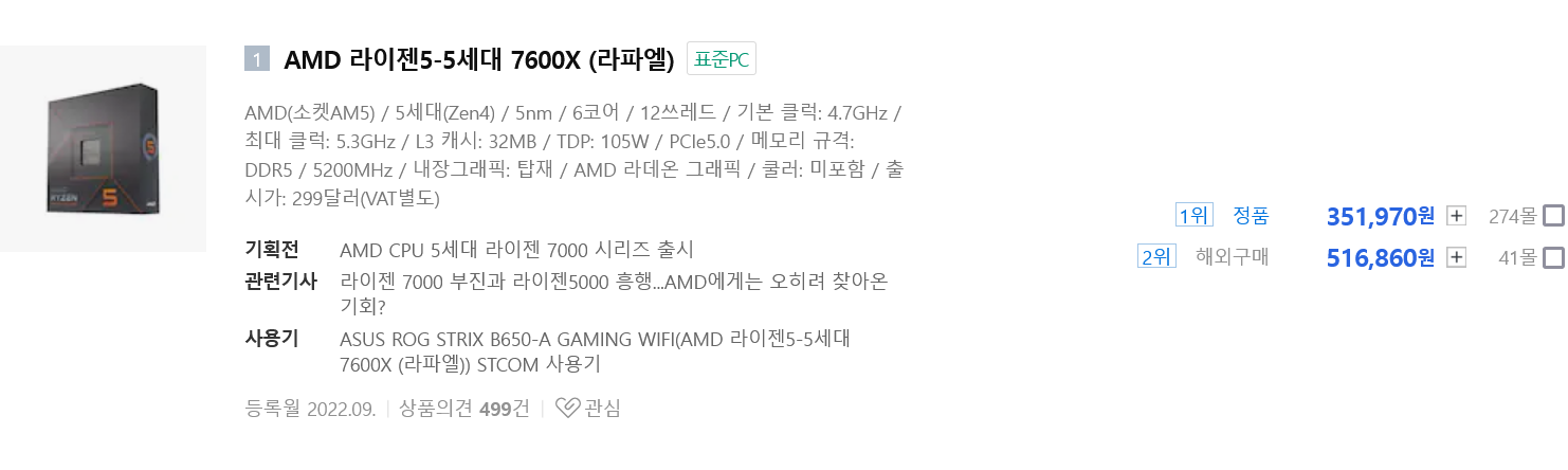 현재 판매가격을 고려하면 7600X가 게이밍 컴퓨터를 조립 준비하시는 분들이라면 선택지가 될거 같습니다.