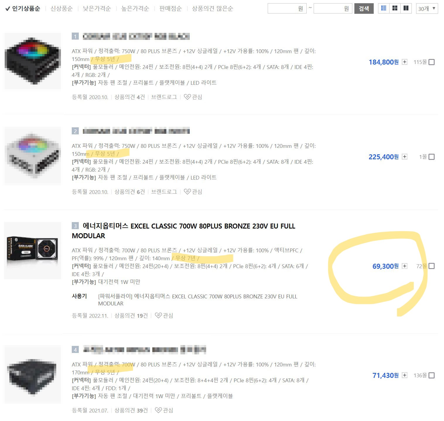 최저가 사이트에서 검색해보면 아시겠지만, 700W 브론즈등급 풀모듈러 제품은 5가지 존재합니다.
