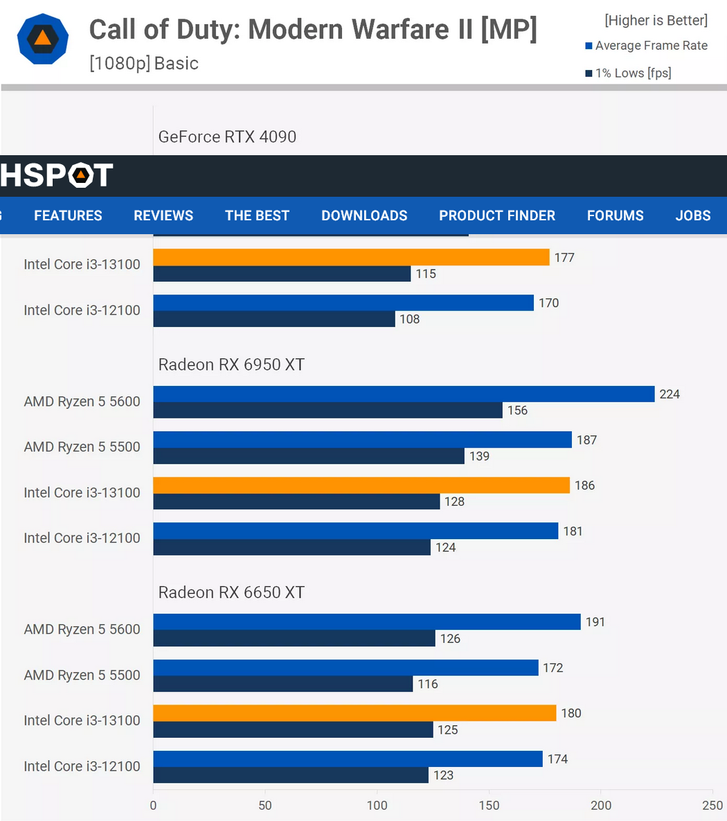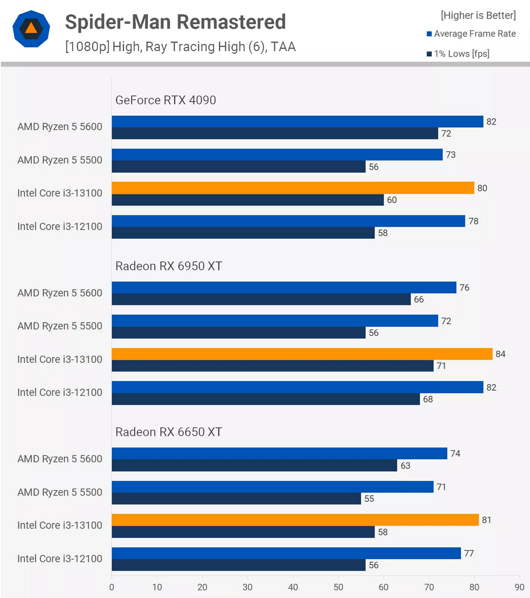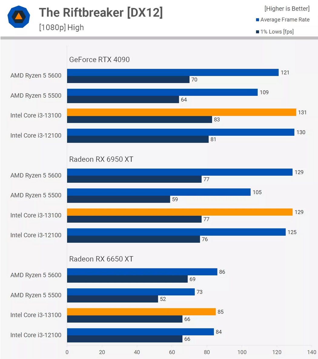 다시 말하지만, 이러한 저가형 프로세서를 사용하는 Radeon 6950 XT는 1080p에서 GeForce RTX 4090보다 훨씬 빠르며 실제로 5600은 Radeon GPU를 사용하여 25% 더 빠릅니다. 꽤 미친 짓이지만 과거 벤치마크. 하지만 CPU 성능 면에서 Ryzen 5 5600과 Core i3-13100은 이 타이틀에서 균등하게 일치하는 것으로 보입니다.