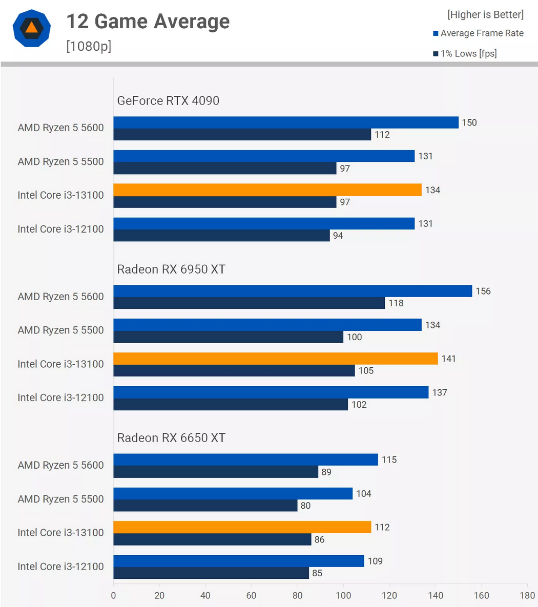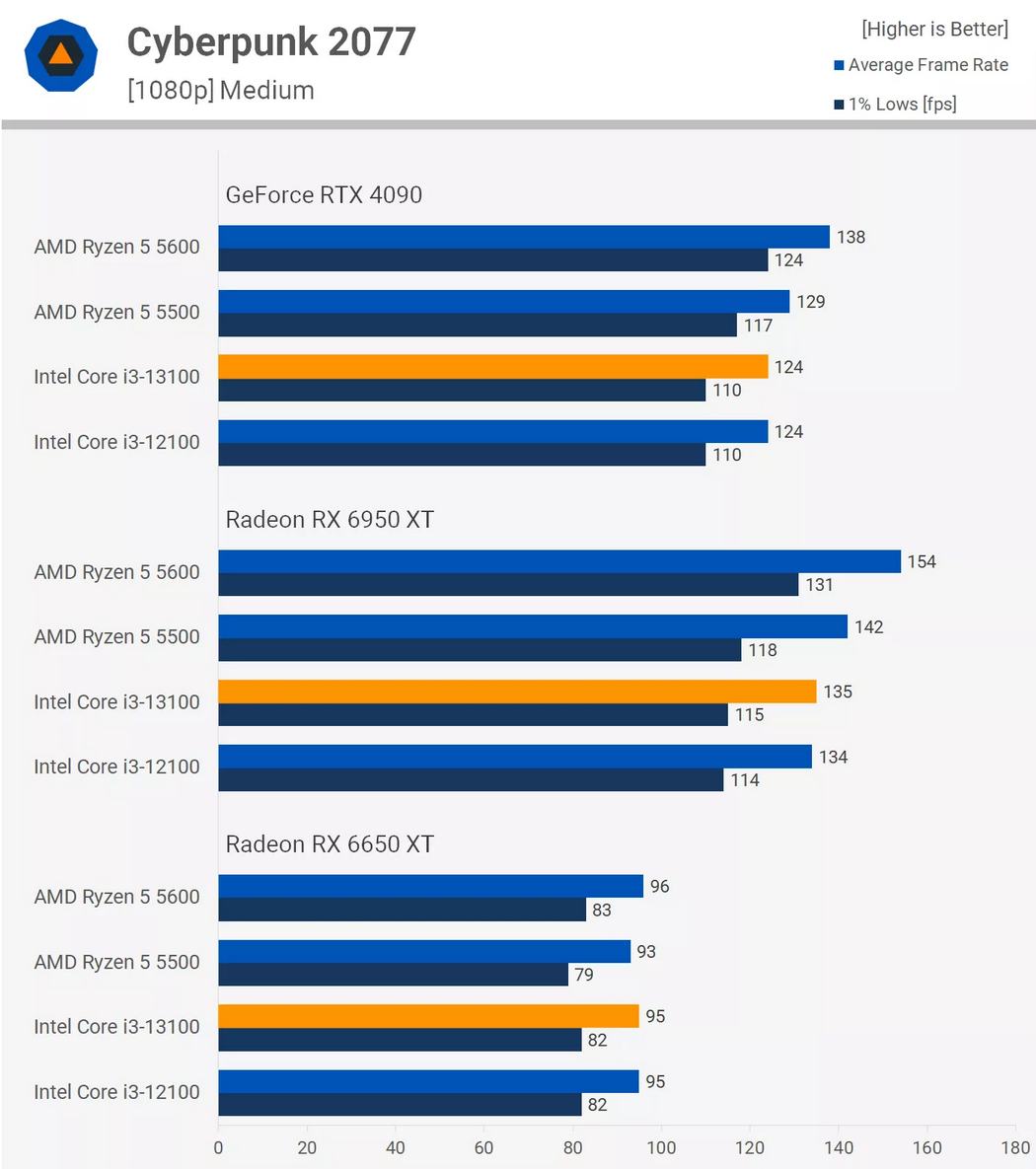 Radeon 6950 XT는 i3-13100과 비교할 때 평균 프레임 속도를 볼 때 Ryzen 5600에 20%, 1% 낮은 경우에 22%를 제공합니다.