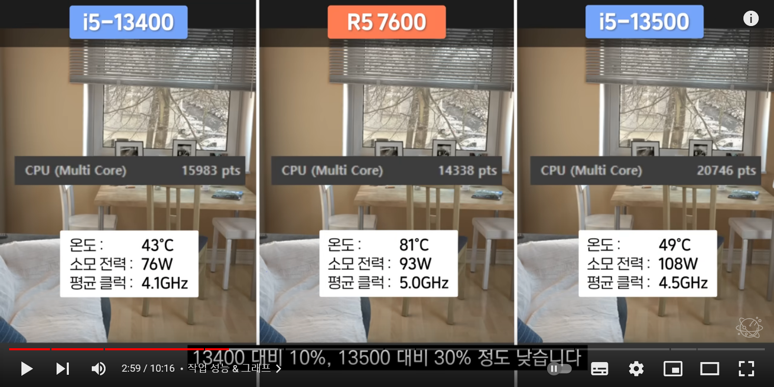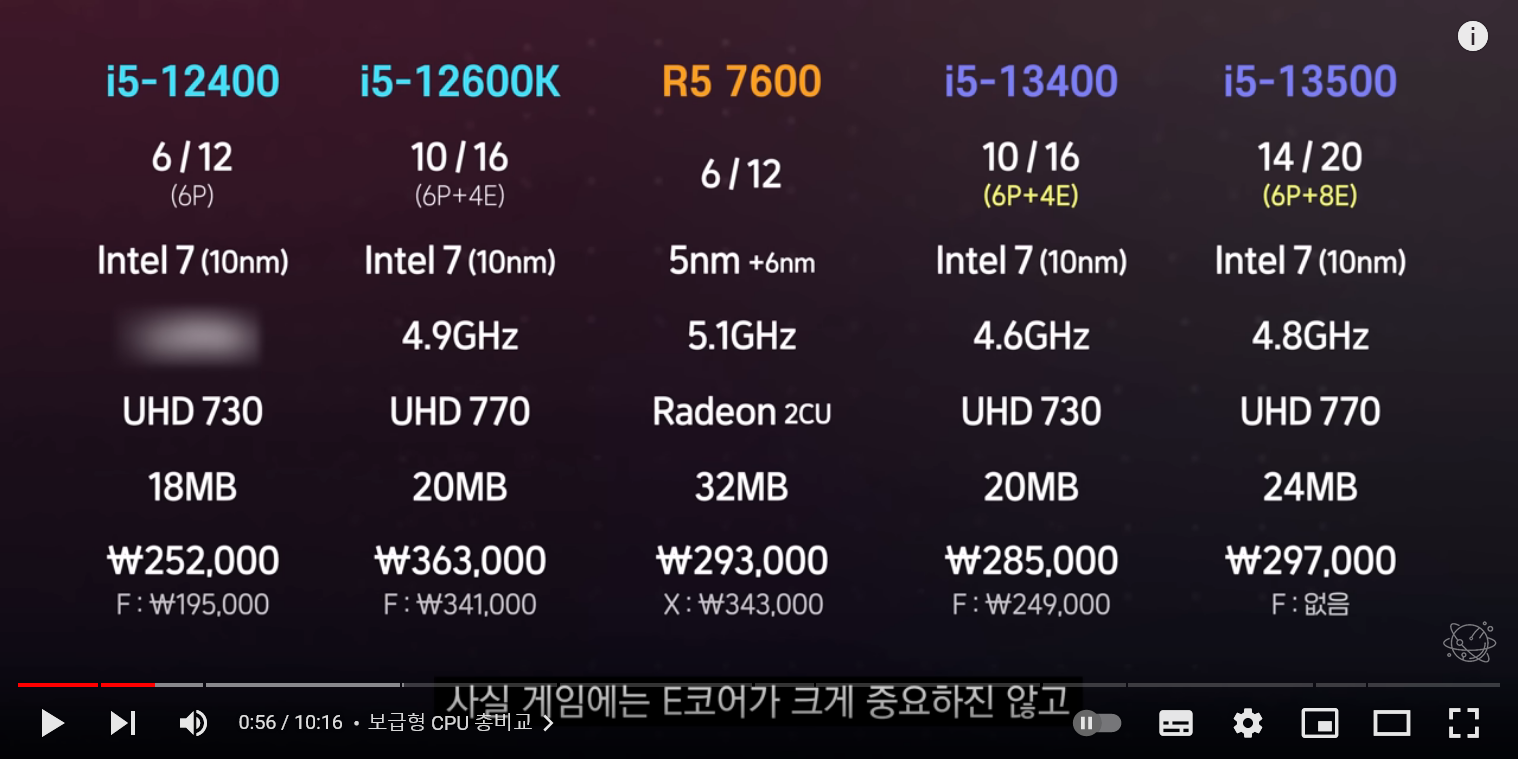 게임에는 중요하지 않은 E코어를 제외하면, 경쟁사 인텔의 i5 CPU대비 P코어 개수는 동일합니다.