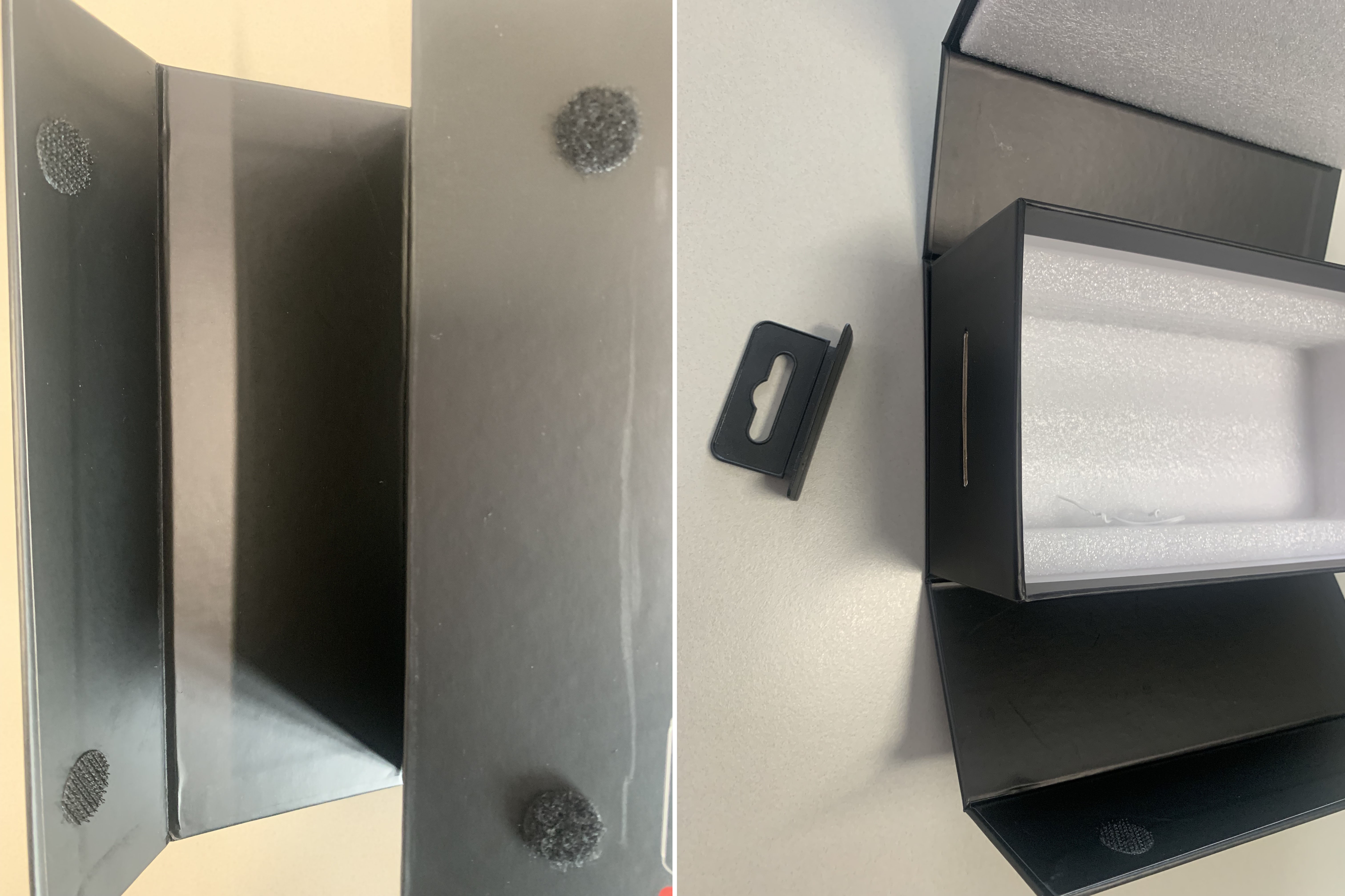 상자는 열고 닫을때 고정이 가능하도록 찍찍이로 되어 있습니다. 상단에 플라스틱 고리를 빼면, 여행가방에 두고 이동해야할때 제품을 충격에 보호용으로 계속 사용할수 있겠습니다.