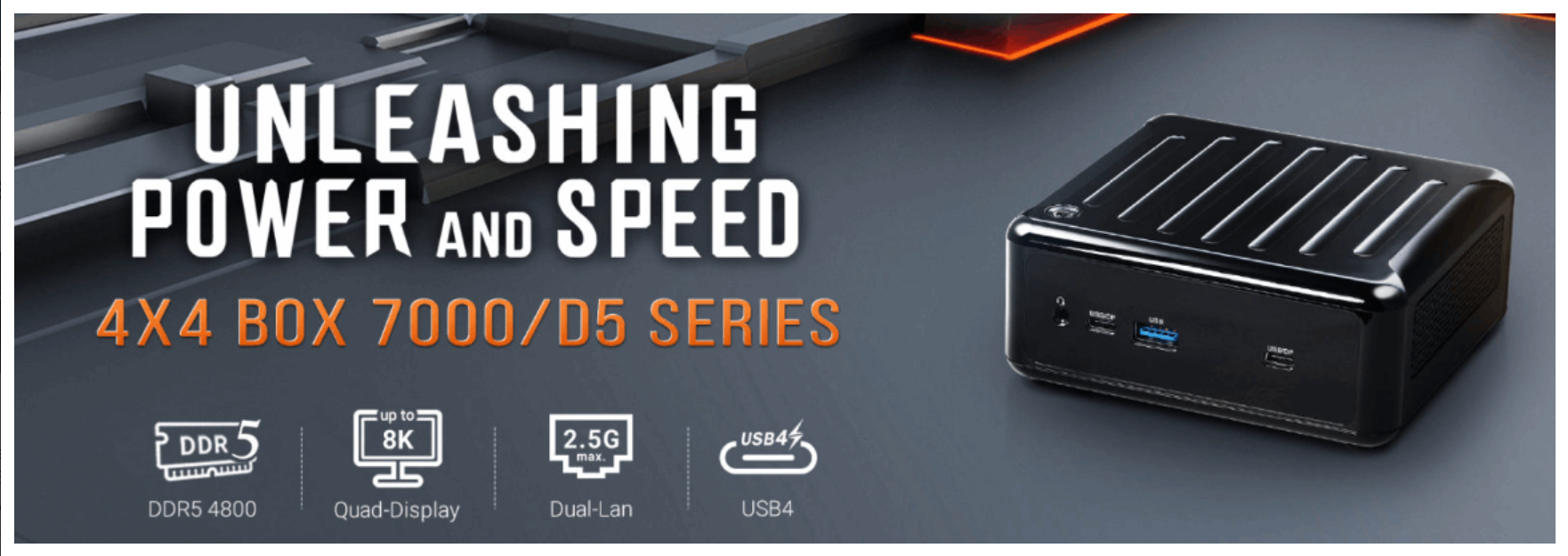 새로운 DDR5 4800MHz 메모리, USB4, 최대 8K 쿼드 디스플레이, 최대 2.5G의 듀얼 LAN, Wi-Fi 6E 및 듀얼 스토리지 지원을 갖춘 4X4 BOX 7000/D5 시리즈 미니 PC는 에너지 효율성을 높이고 환경을 감소시킵니다. 하이엔드 게임, 콘텐츠 제작, 사무 생산성, 비즈니스 및 AIoT 애플리케이션에서 더 빠른 속도를 제공합니다.